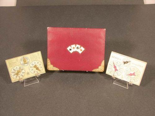 Leather playing card box with card suit on lid. Comes with two scorekeepers. Holds two decks. 6" x 4.5" Ex. cond.