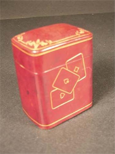 Leather with gold trim and dome top playing card case, holds 2 decks. 4" x 3" x 2" Ex. cond.