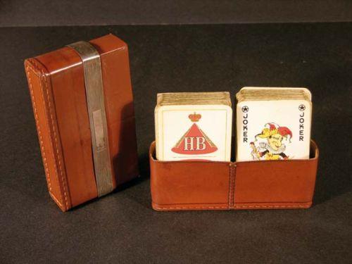 Leather playing card case with sterling silver band, holds 2 decks, circa 1910. 5.25" x 4" x 1.25" Ex. cond.