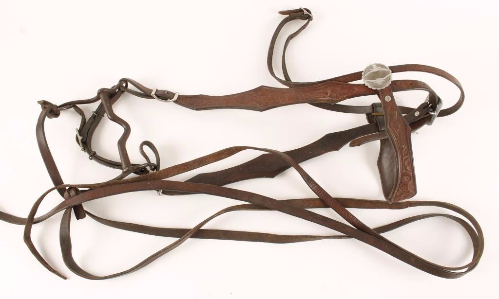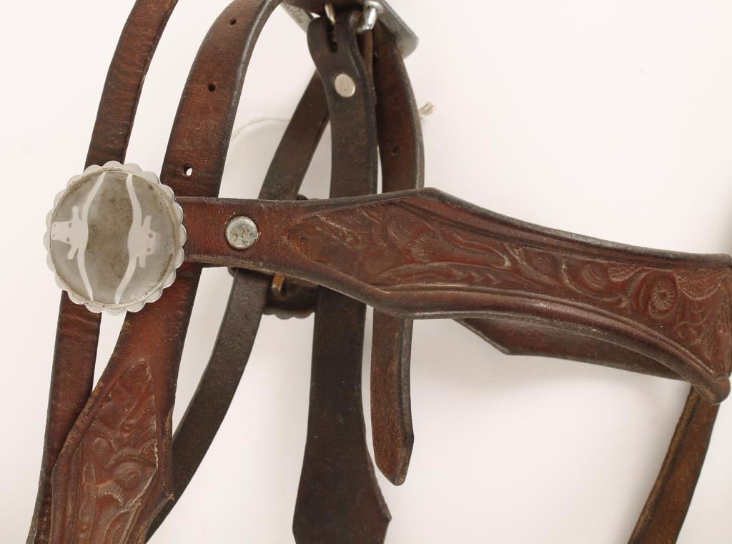 Floral tooled bridle with longhorn rosettes. Unmarked bit with reins. Good condition.