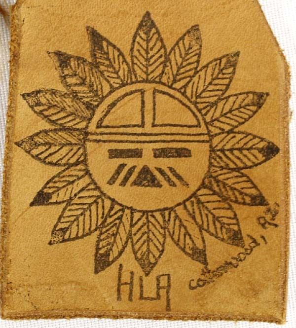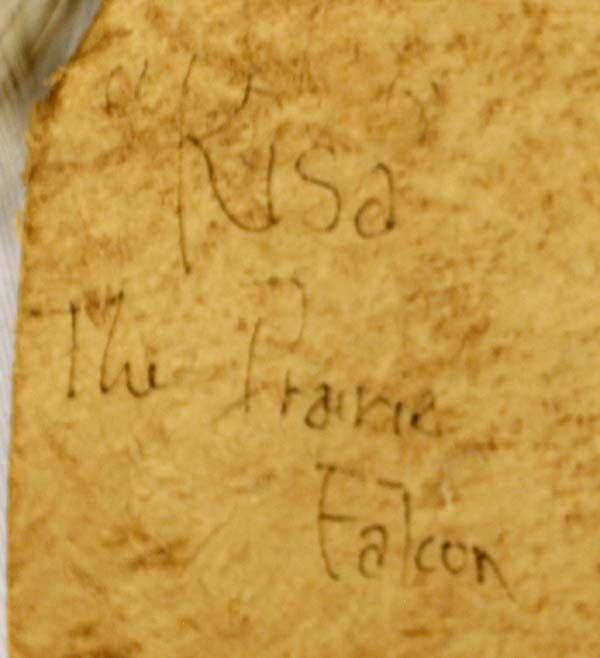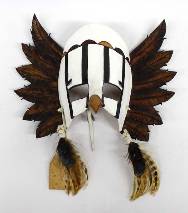 Massey Estate: Leather Prairie Falcon Mask by HLA of Cottonwood AZ, embellished with feathers, measures 13.5''L x 12''W x 5''H, well executed with intricate details on the leather feathers, hand painted