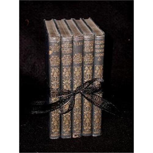 By the author of "Elizabeh's German Garden",this delightful set is navy blue leather front,back and spine with gold engraved lettering and floral design on spine as well as the "E" on the front of each. Gilt top pages on each. Published by Macmillian and Co,Limited St Martin's Street,London 1929. Photos of additional works,this set is signed on each front cover with "Valerie Broughauss Masset This Christmas 1931". The set of 5 includes,"Elizabeth and Her German Garden,The pastor's Wife,Fraulen Schnmidt and Mr. Anstruther,Vera,The Adventures of Elizabeth in Rugenz".First published in 1898,this being the first pocket edition in 1929.Rave reviews pictured by T.P.'s Weekly,The Times,The Morning Post,Evening Standard and Country Life. Beautiful set and such good reading. Excellent condition,measures 7H X 3/4W X 4.5D. Page ribbons in some volumes.