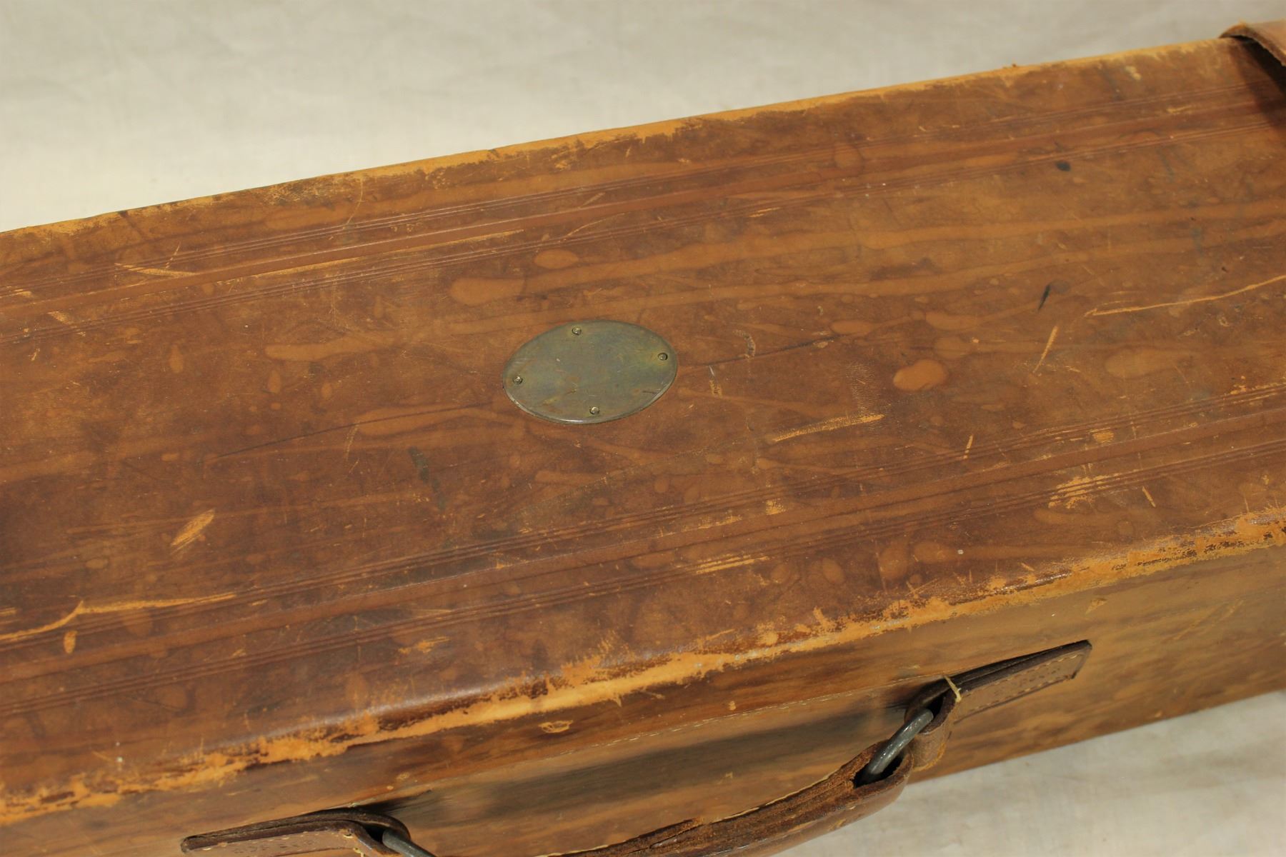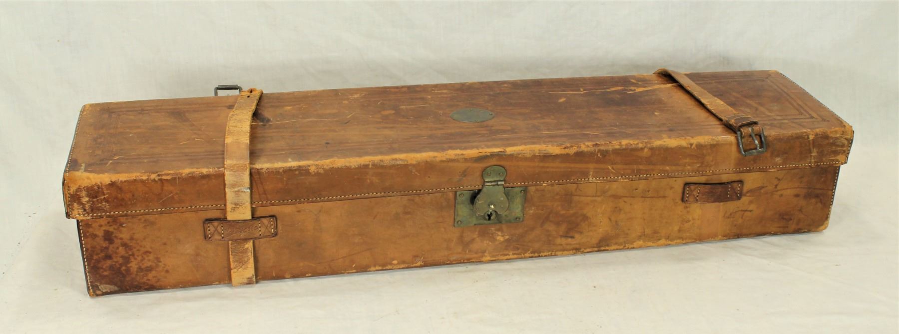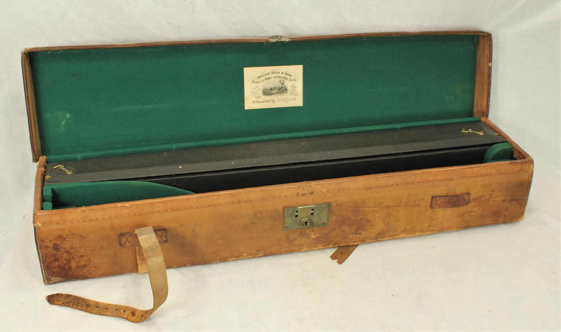 Beautiful early high quality leather shotgun case with green felt lining, interior compartments and maker's label in lid, "William Read & Sons, Boston". Dimensions 34"x 8"x 6".