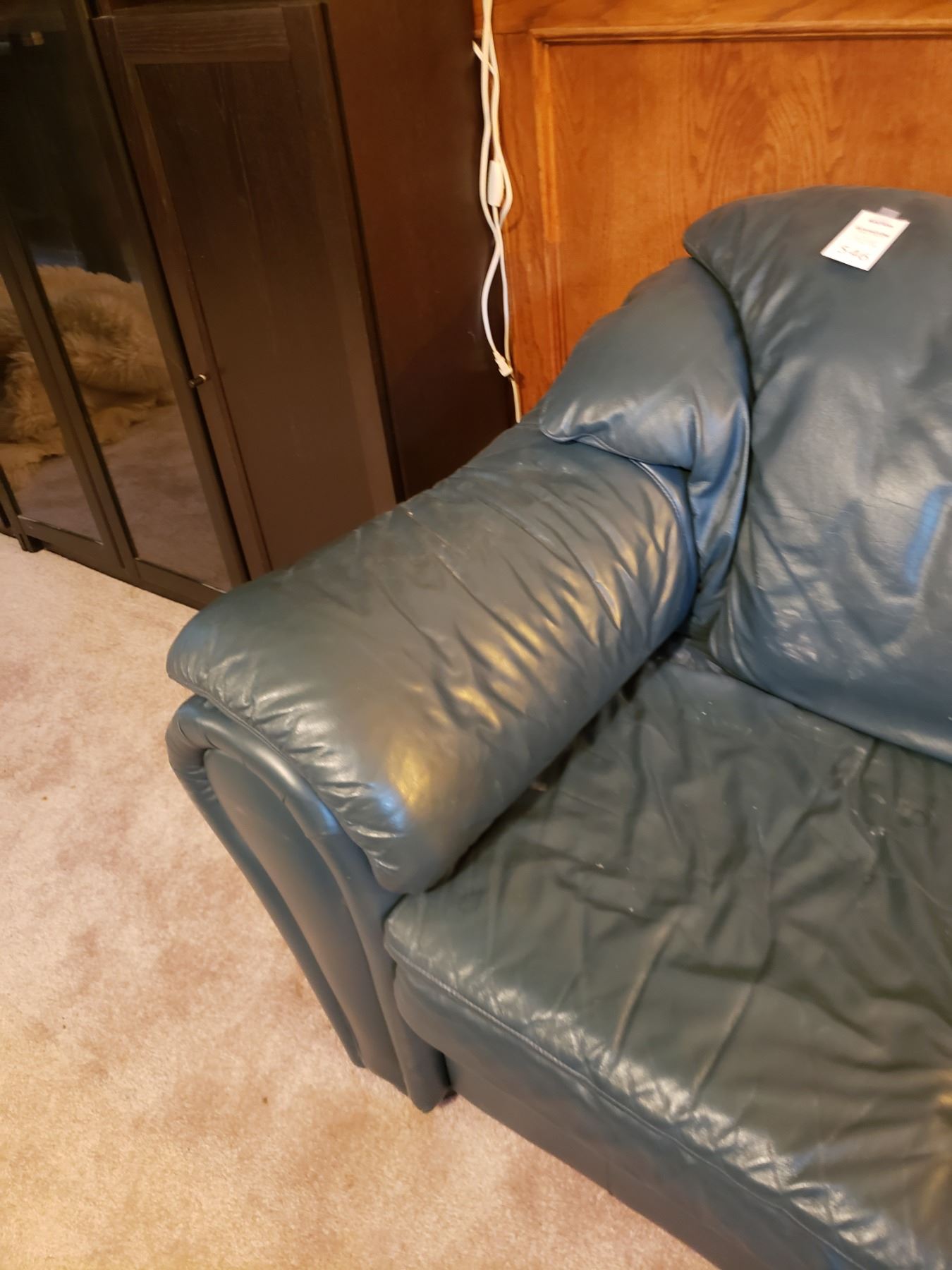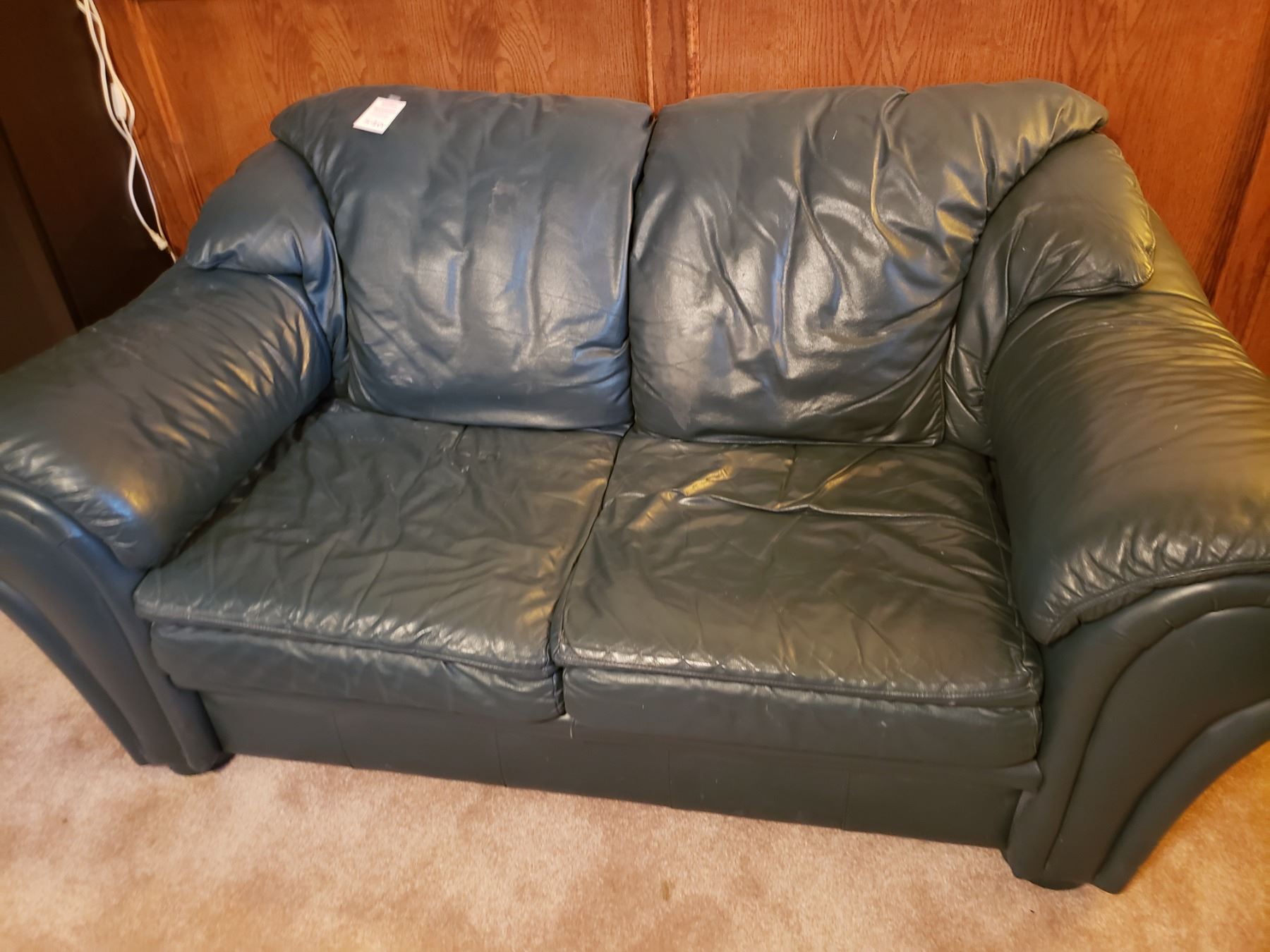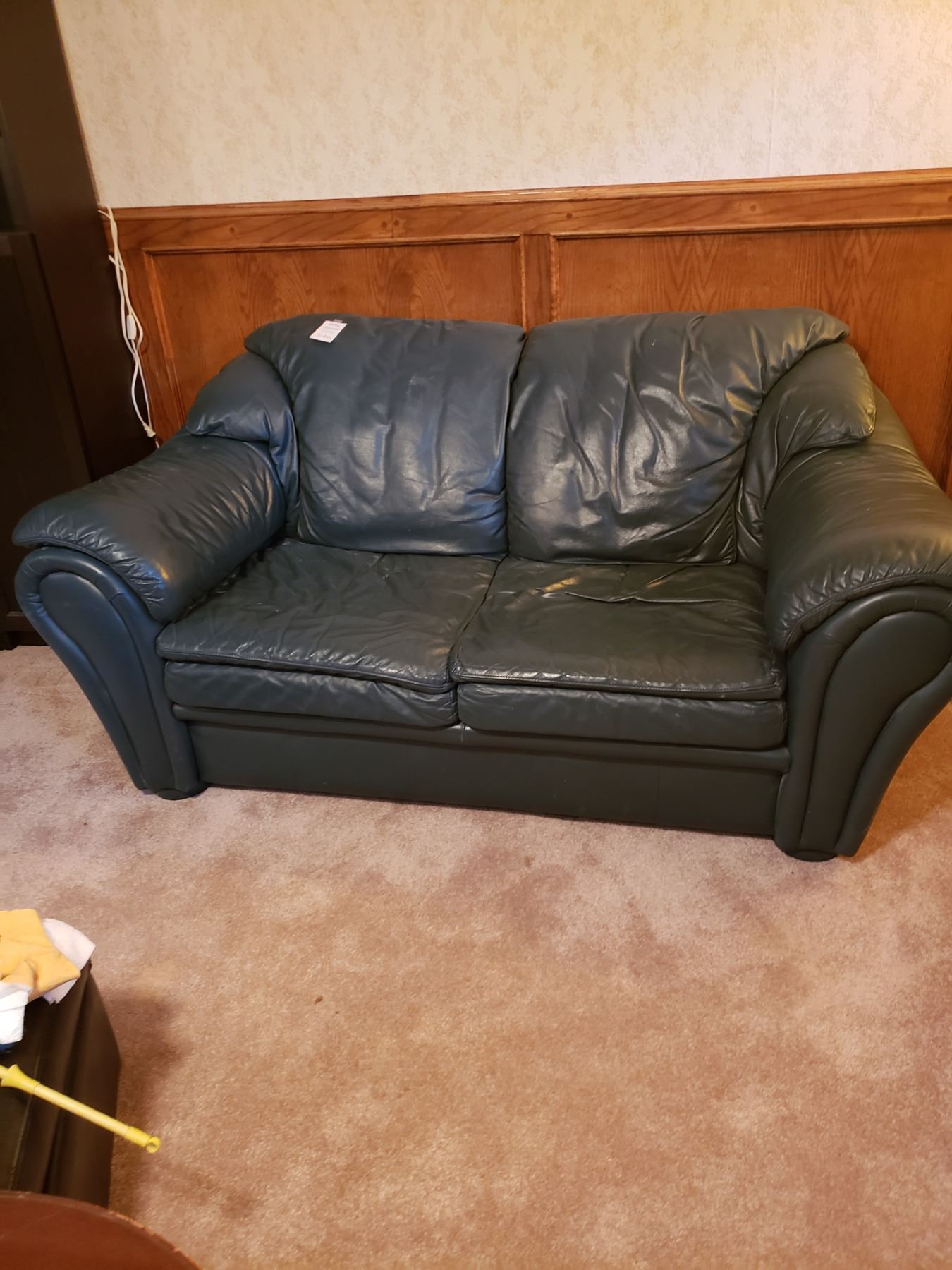 Green leather sofa with some wear, 68x36x32. Very heavy, bring appropriate help to move in category C between 11am and 12pm.