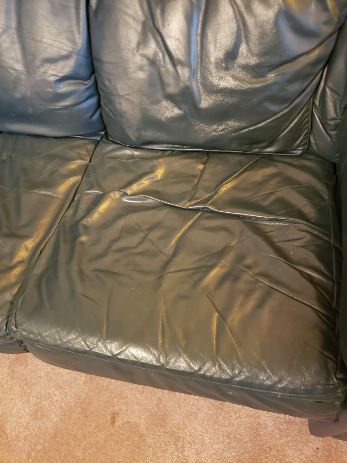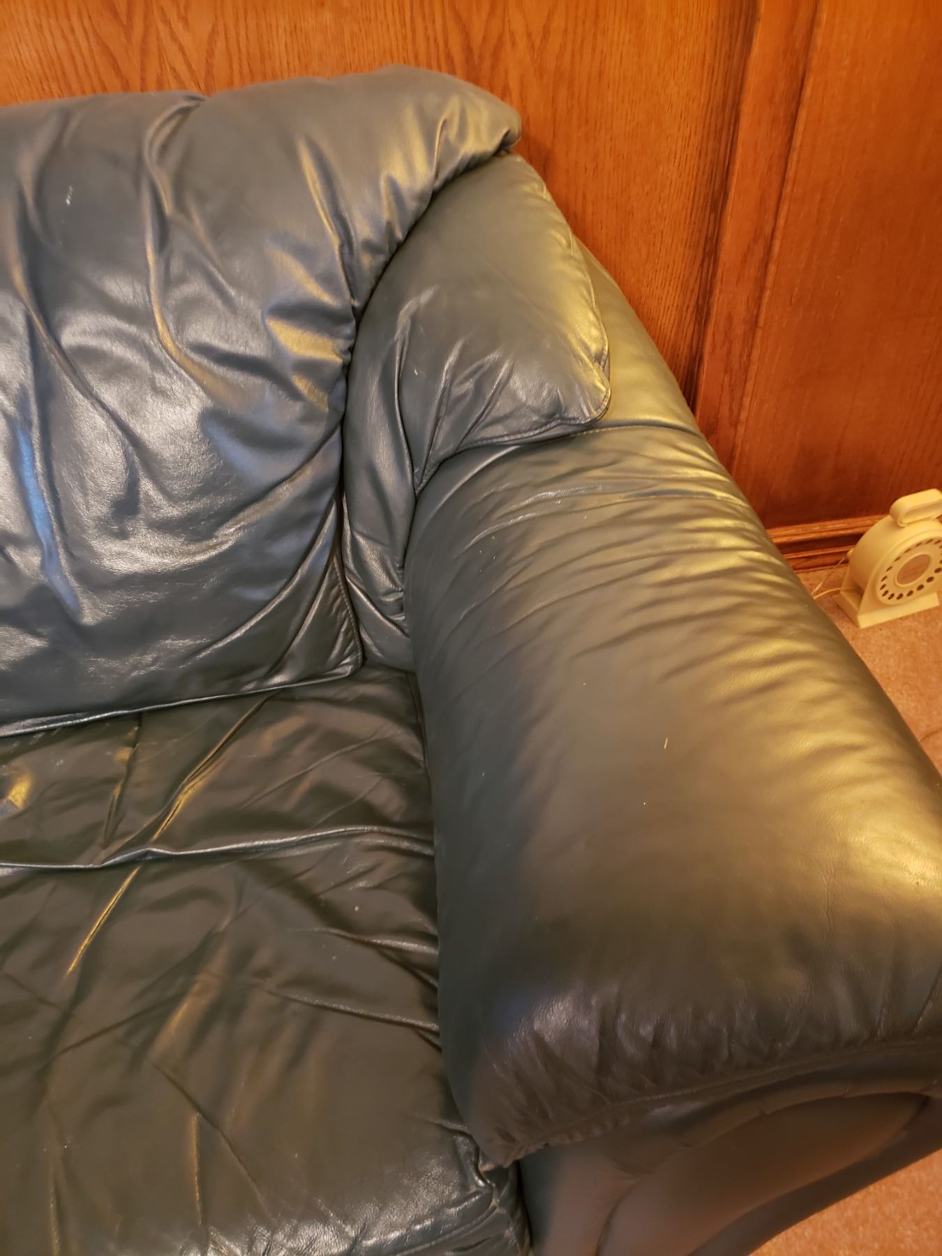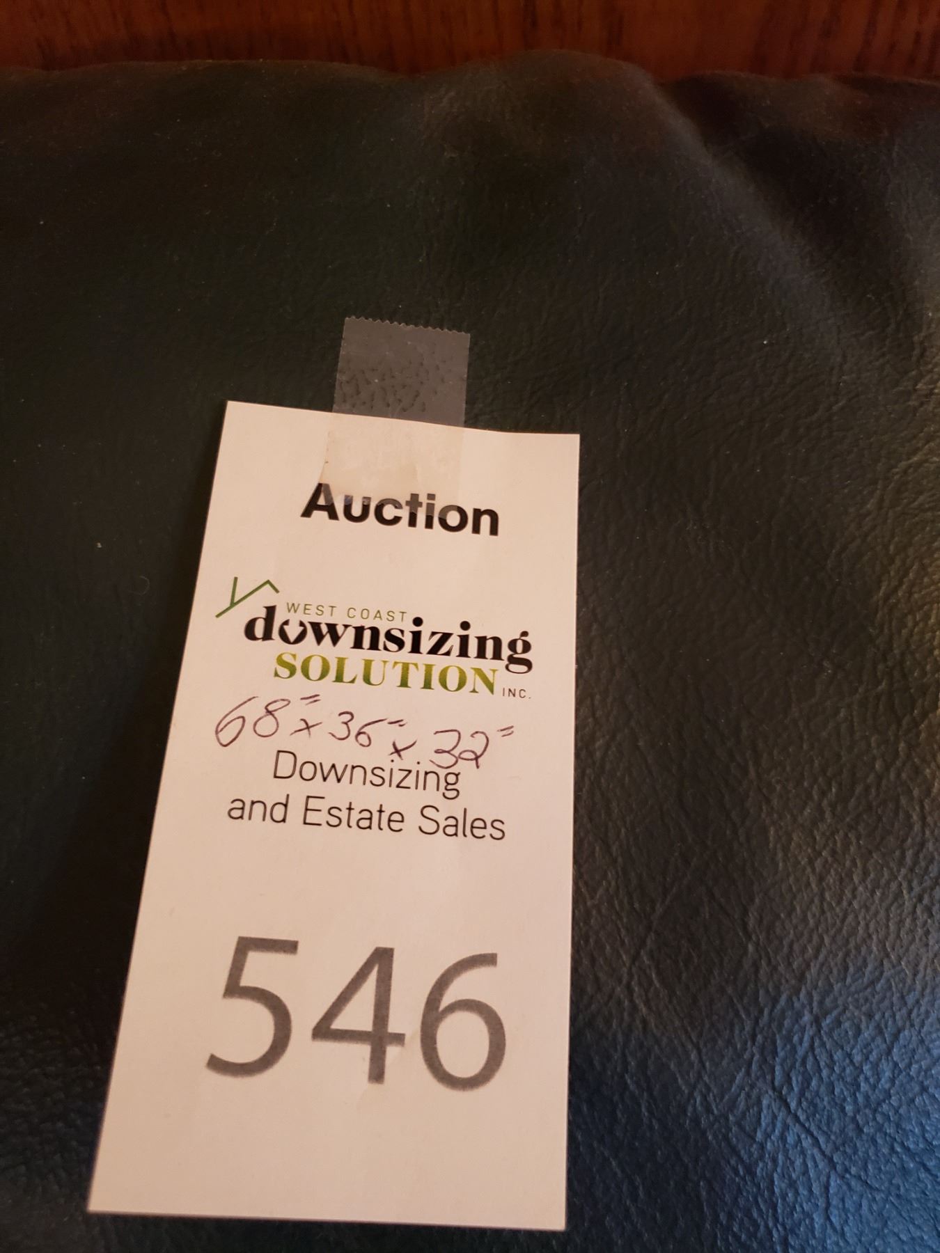 Green leather sofa with some wear, 68x36x32. Very heavy, bring appropriate help to move in category C between 11am and 12pm.