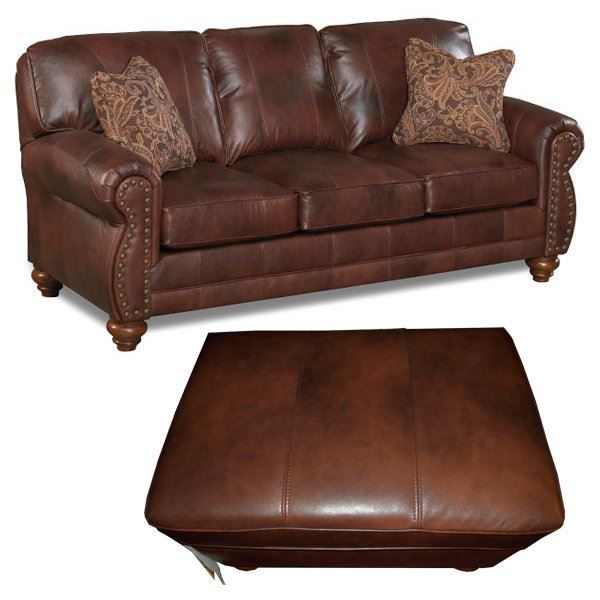 Brand new, never used matching leather sofa and ottoman from the Home Traditions line. Smooth, blown, semi-attached square back is banded and corded with added comfort of baffled bag in the back. Smooth, rolled arms flow into stepped-in back where they converge with the contoured and padded lwoers arms. The front of the arms is covered with face caps that are accented with brass tacks. Bun legs which distressed Peacn finish, made in USA. Sofa measures 83.5" wide, width/arms 63.75", height/arms 27", Cush. Depth 21.5", Height 38.25", depth 39", seat 20.75". Ottoman measures 32 1/2" wide x 21 3/4" deep x 19" height. Was purchased brand new and was too big for room it was intended to go into. This sofa and ottoman were never used and in brand new condition. Owner originally paid over $2,400 for these pieces.