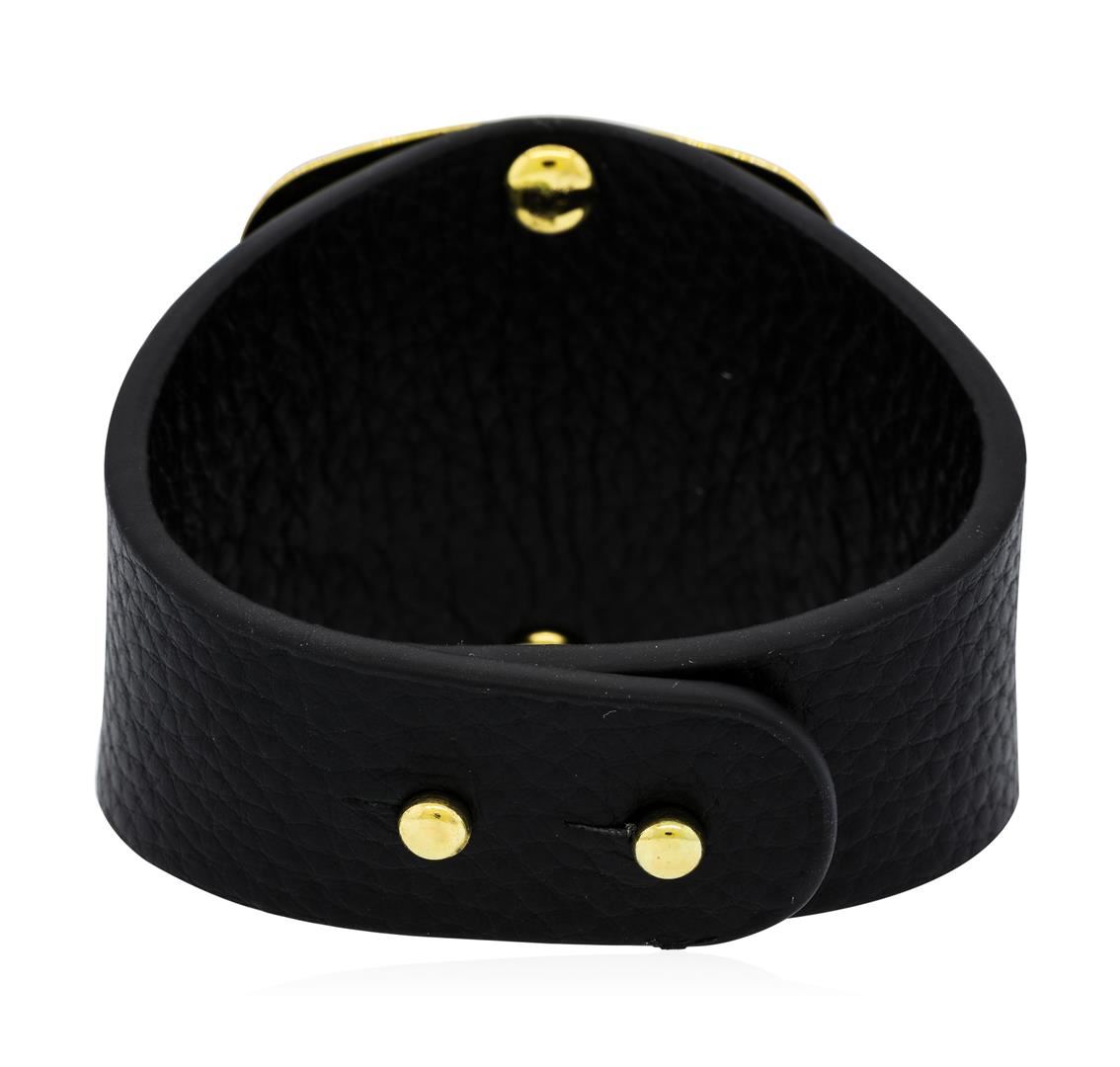 High end designer jewelry. Leather Strap Bracelet - Rhodium Plated. Gold Plated Metal. Black/ Gold. 7-8inches. Total Weight: 34.8 grams.