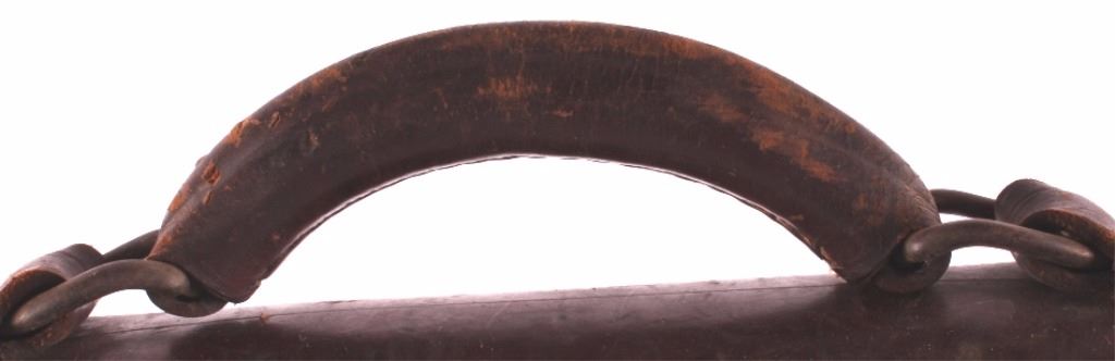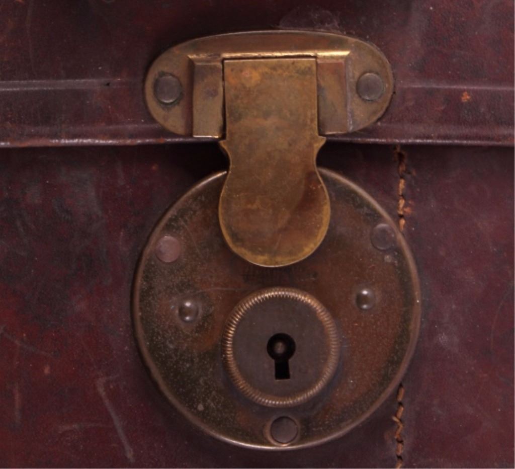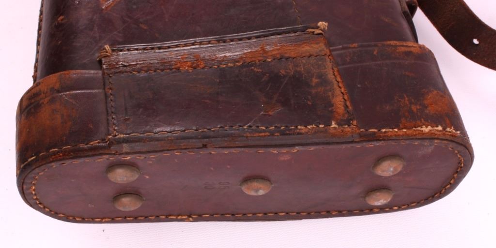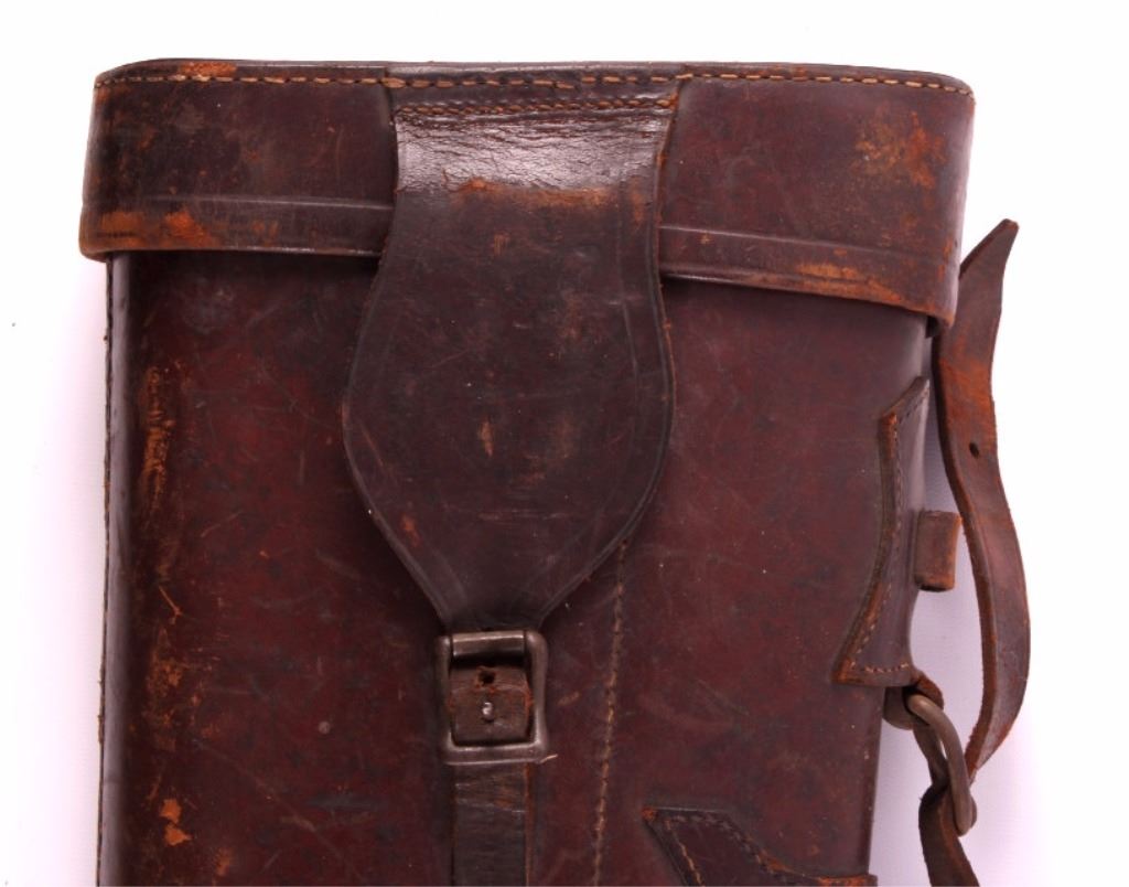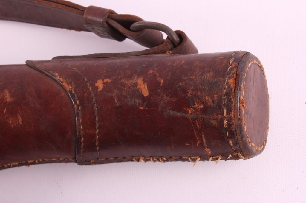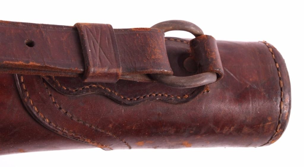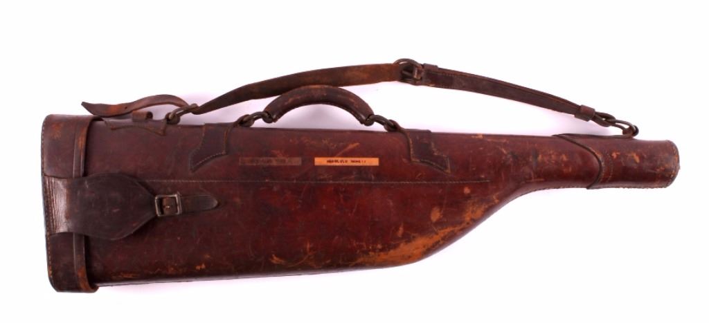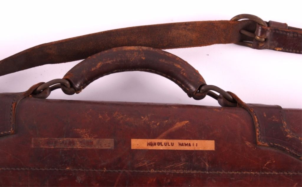 This is a leather take down rifle case. The case is marked "Honolulu Hawaii". It has a lock with a key that is in working condition. This piece is believed to have belonged to a serviceman in WWII. It shows good condition. The leather rifle case measures 9.25" x 31.5".