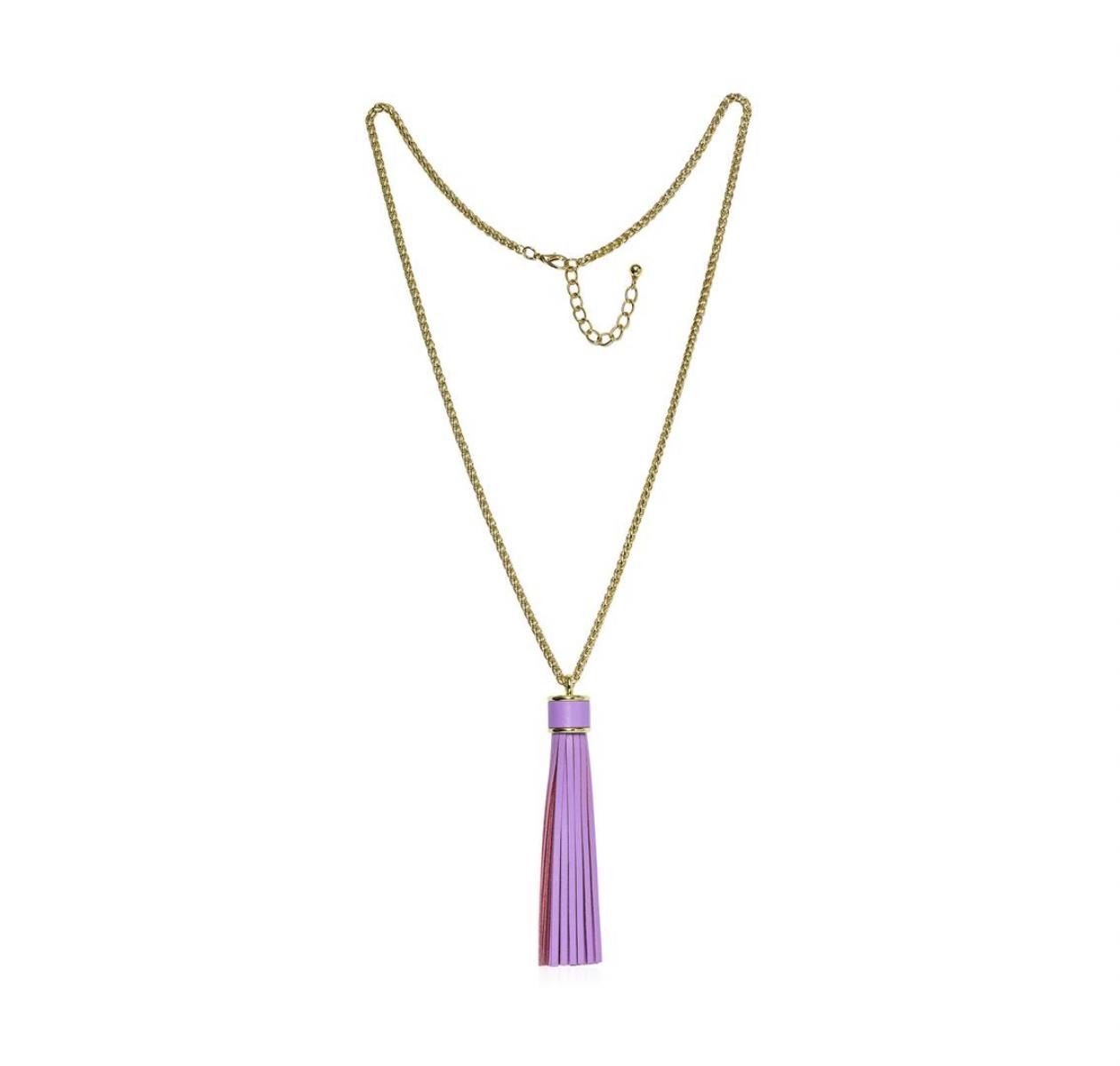 High end designer jewelry. Leather Tassel Chain Necklace - Gold Plated. Gold Plated Metal/3" Ext Clasp. Lilac/ Gold. 32/5inches. Total Weight: 61.7 grams.