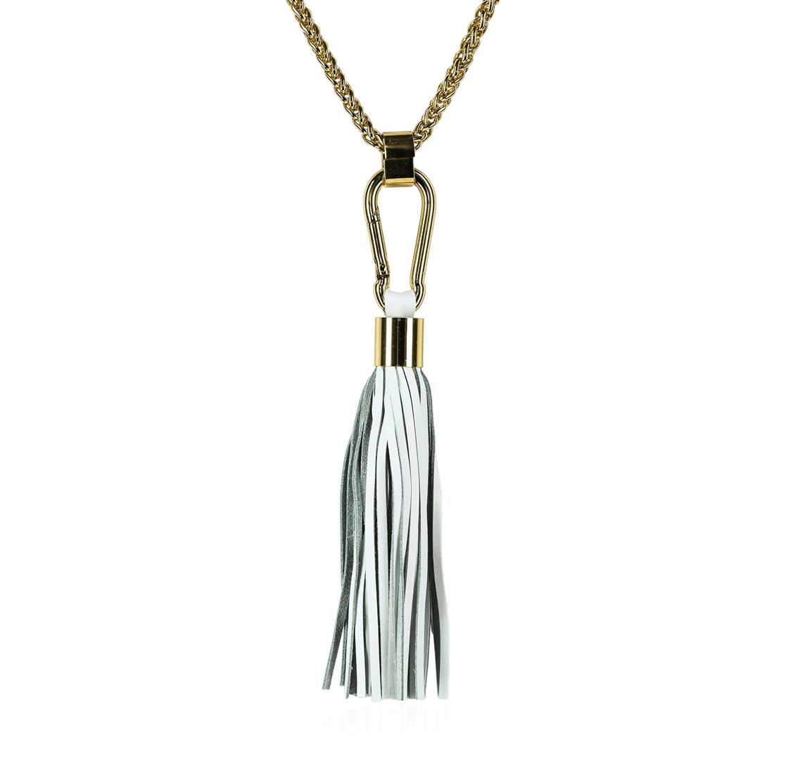 High end designer jewelry. Leather Tassel Hook Pendant Necklace - Gold Plated. Gold Plated Metal/3.5" Ext Clasp. White/gold. 24/7inches. Total Weight: 96.4 grams.