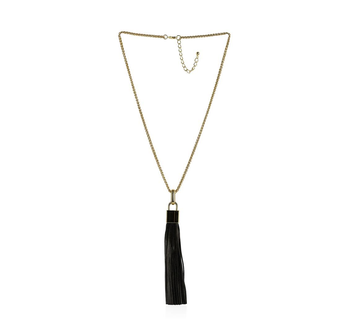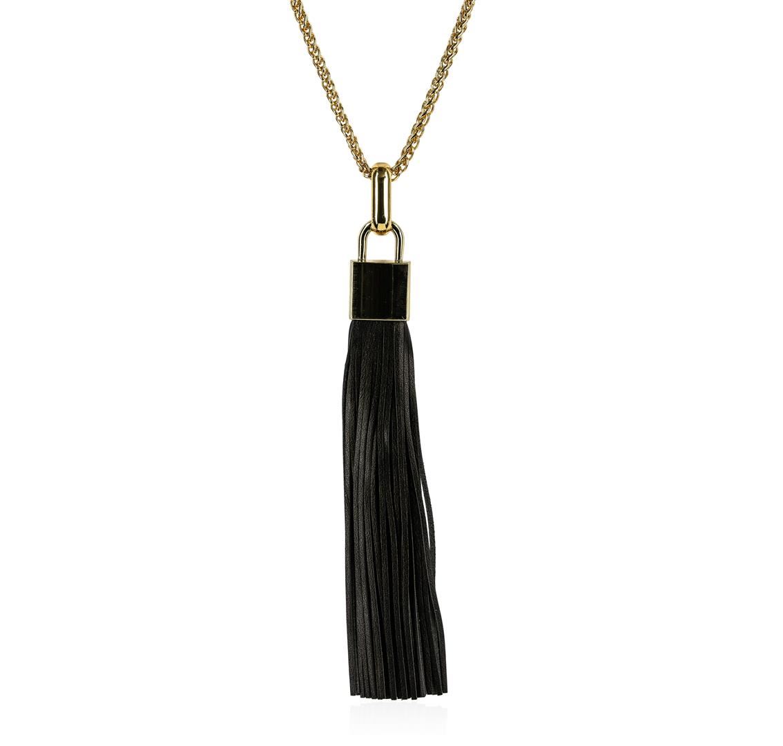 High end designer jewelry. Leather Tassel Square Pendant Chain Necklace - Gold Plated. Gold Plated Metal/3" Ext Clasp. Black/ Gold. 28/6inches. Total Weight: 65.2 grams.