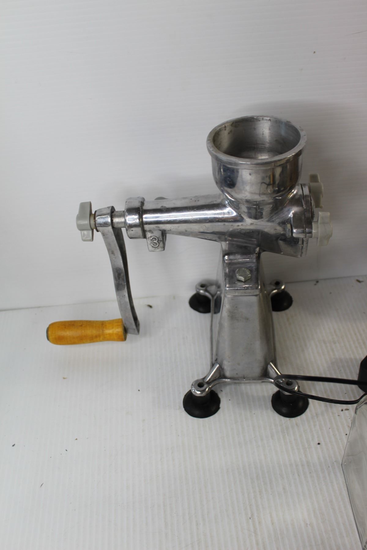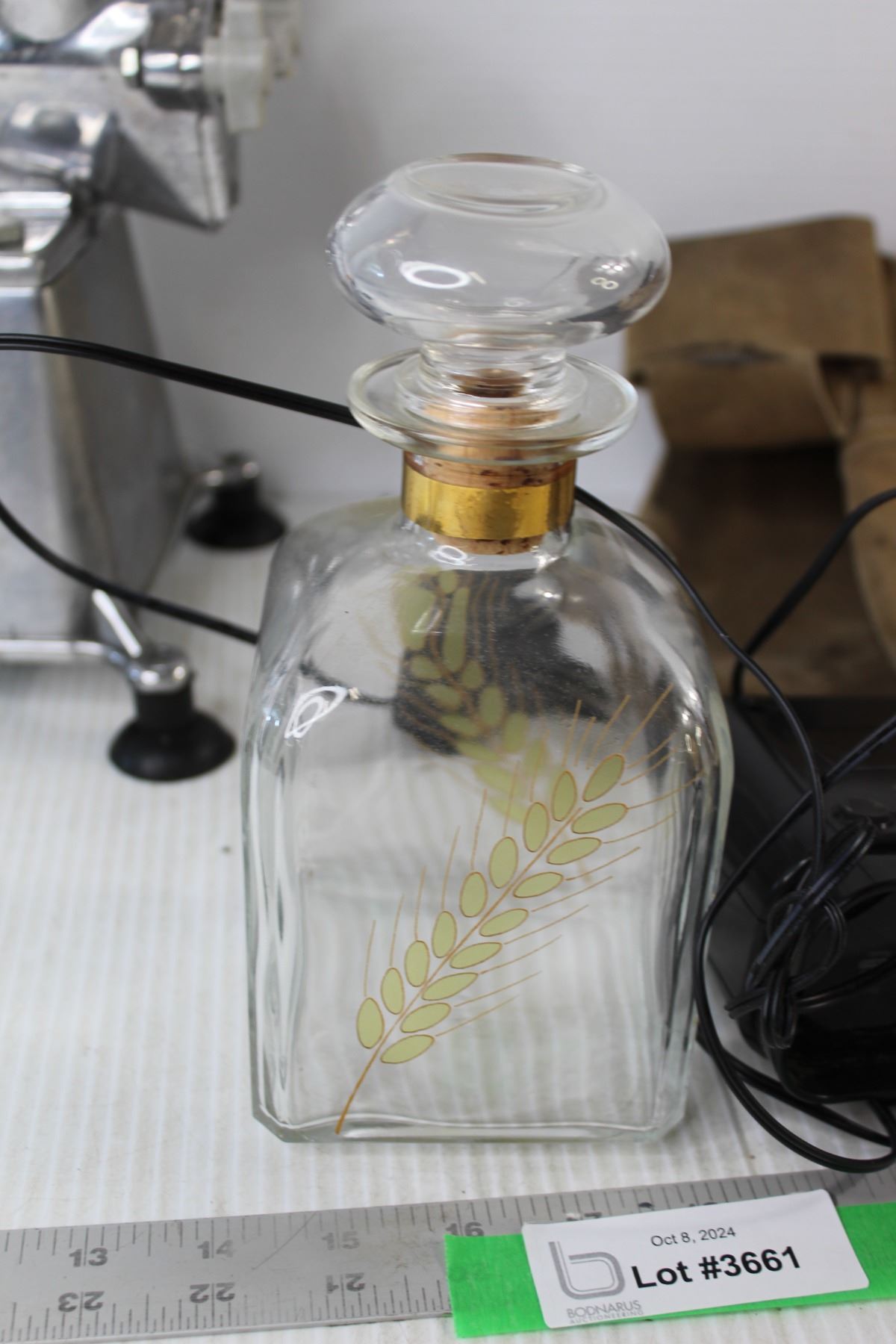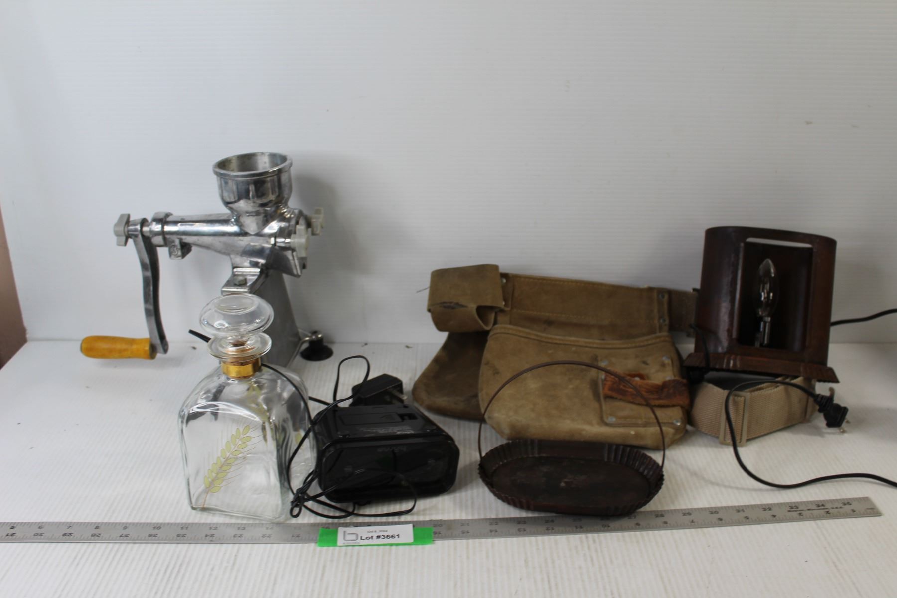 Leather Tool Belt, Lamp - tested Powers On, Meat Grinder, Liquor Bottle, Alarm Clock - Tested Powers On