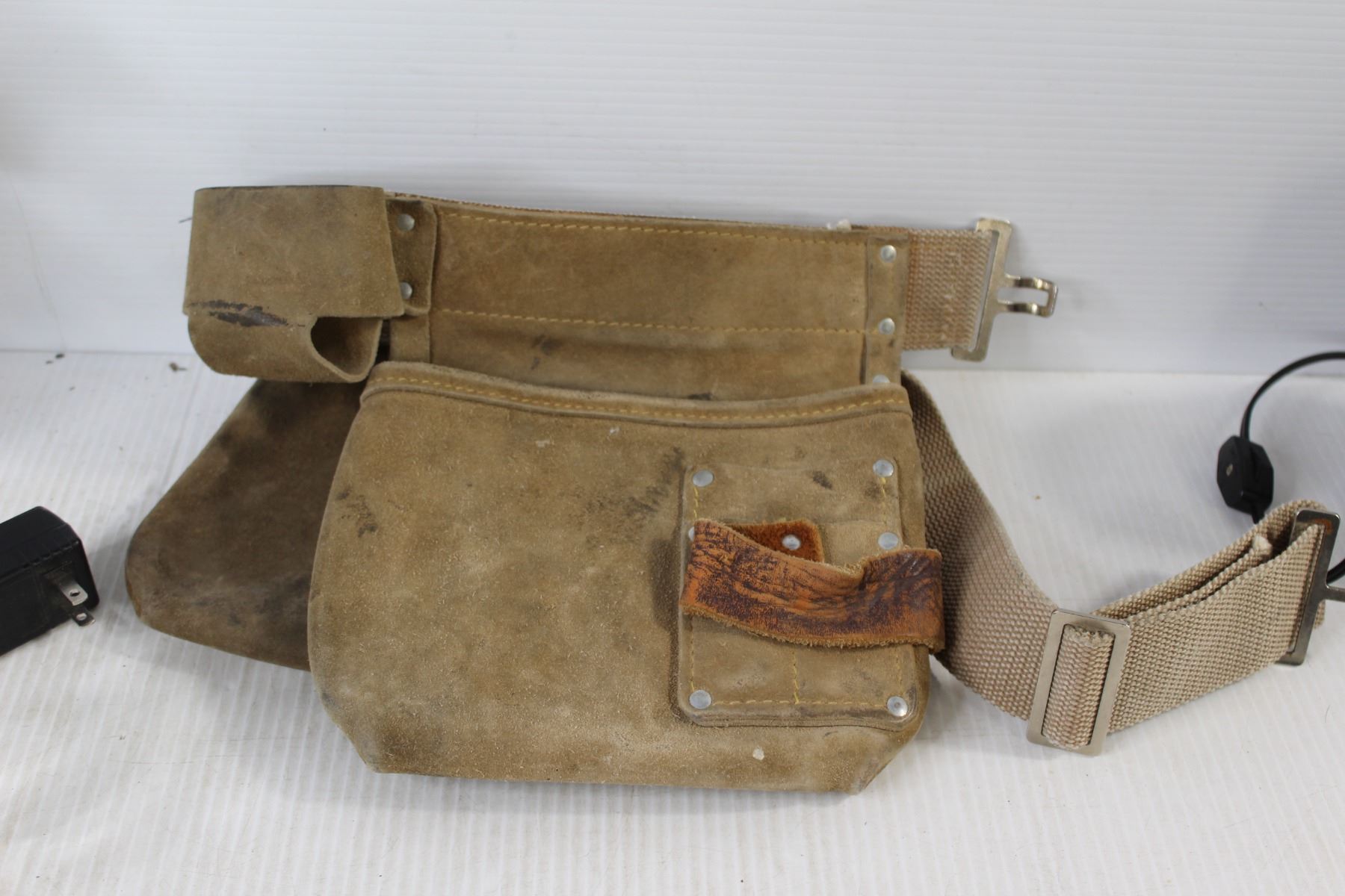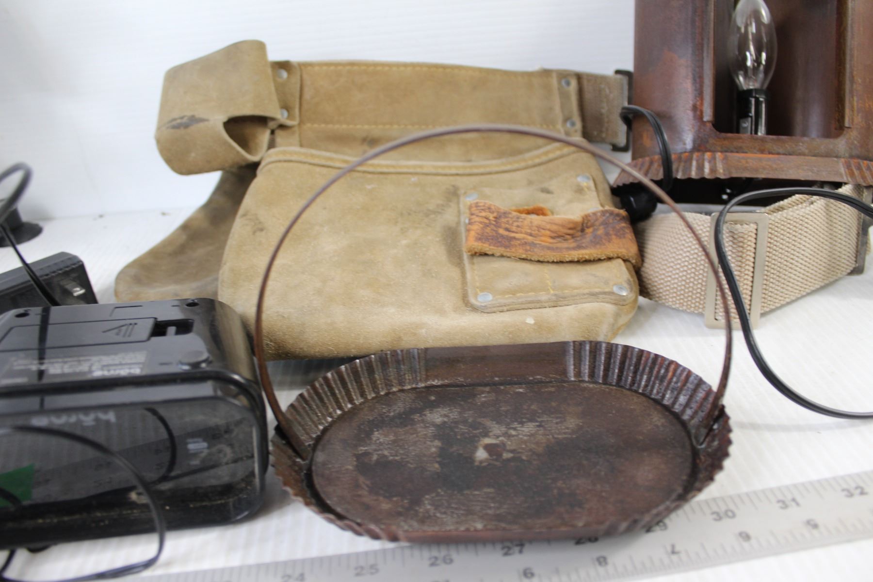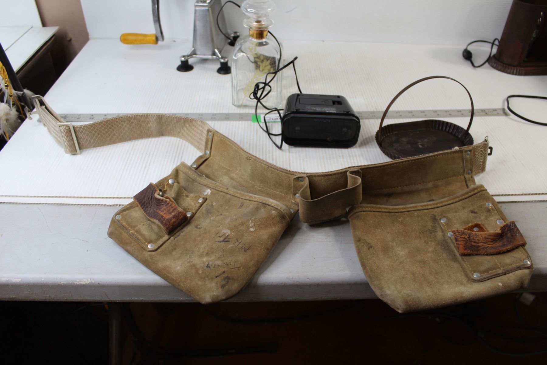 Leather Tool Belt, Lamp - tested Powers On, Meat Grinder, Liquor Bottle, Alarm Clock - Tested Powers