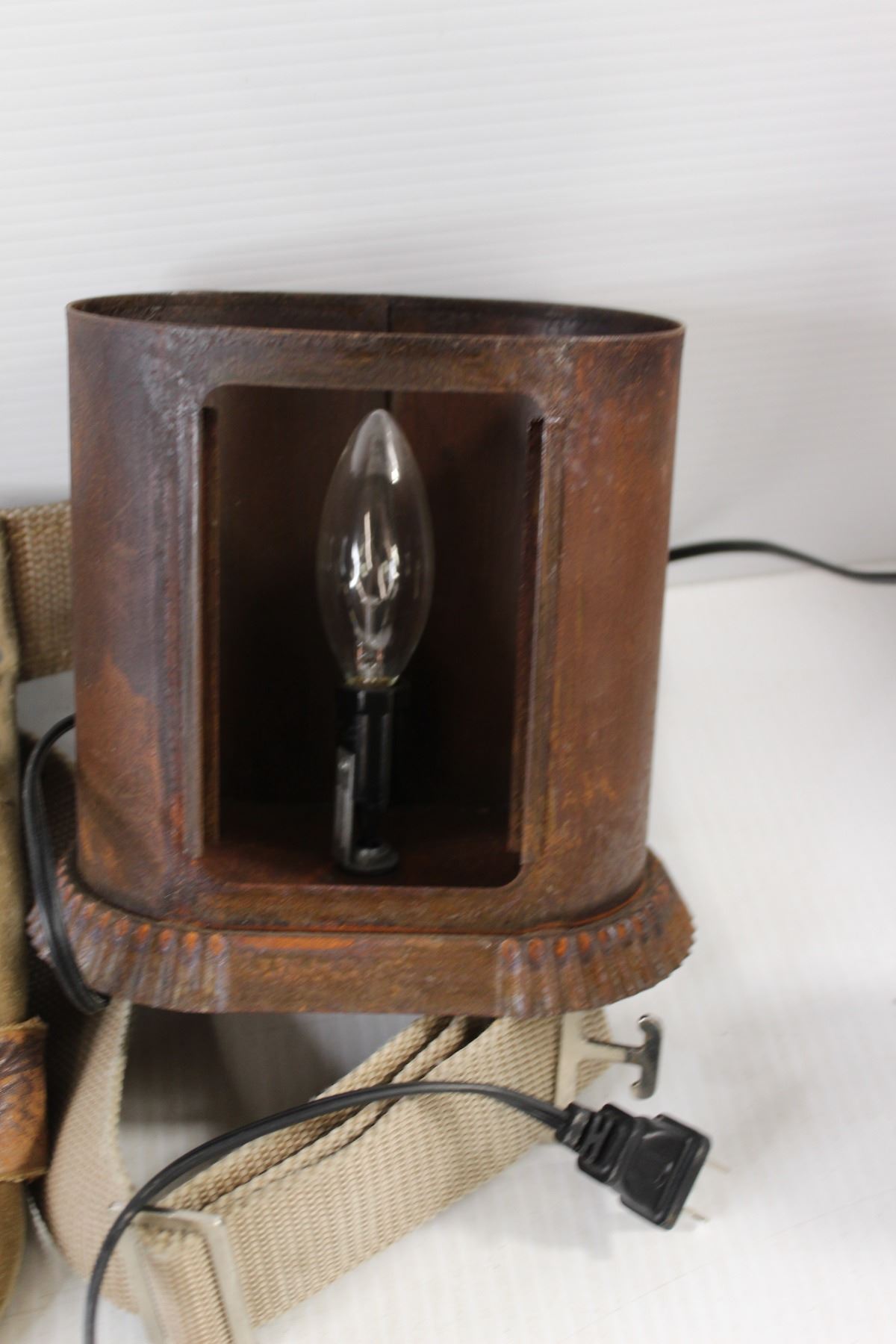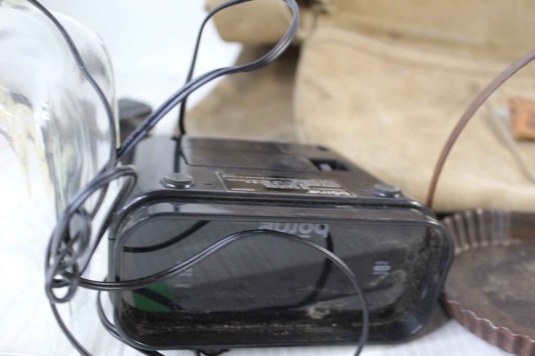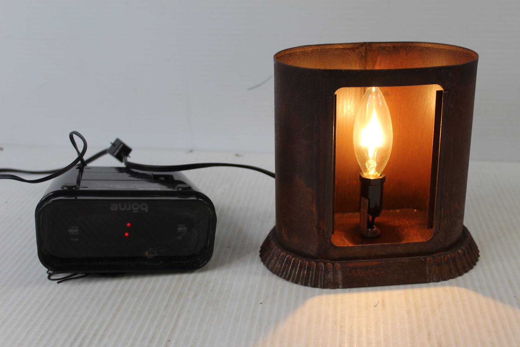 Leather Tool Belt, Lamp - tested Powers On, Meat Grinder, Liquor Bottle, Alarm Clock - Tested Powers