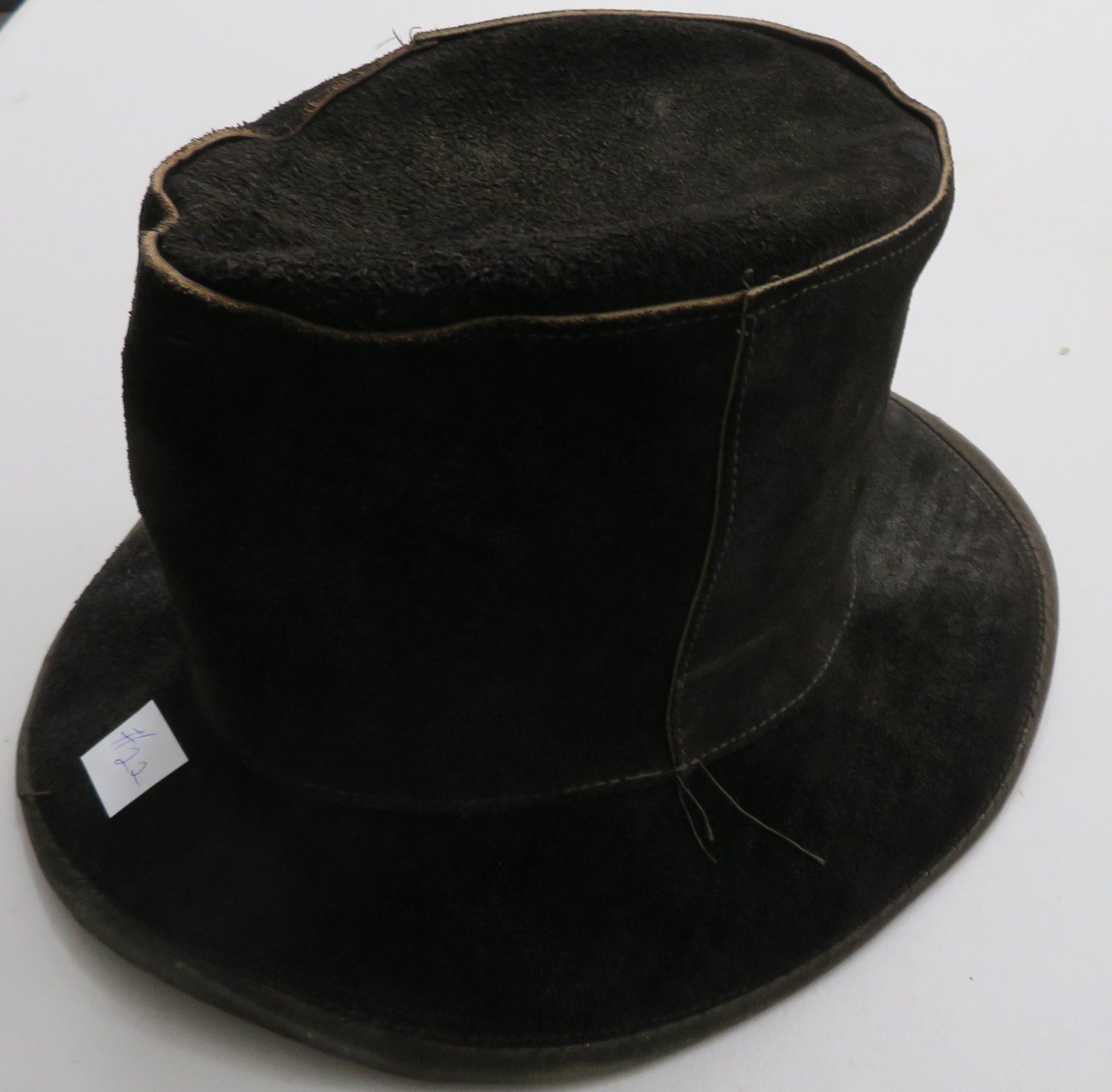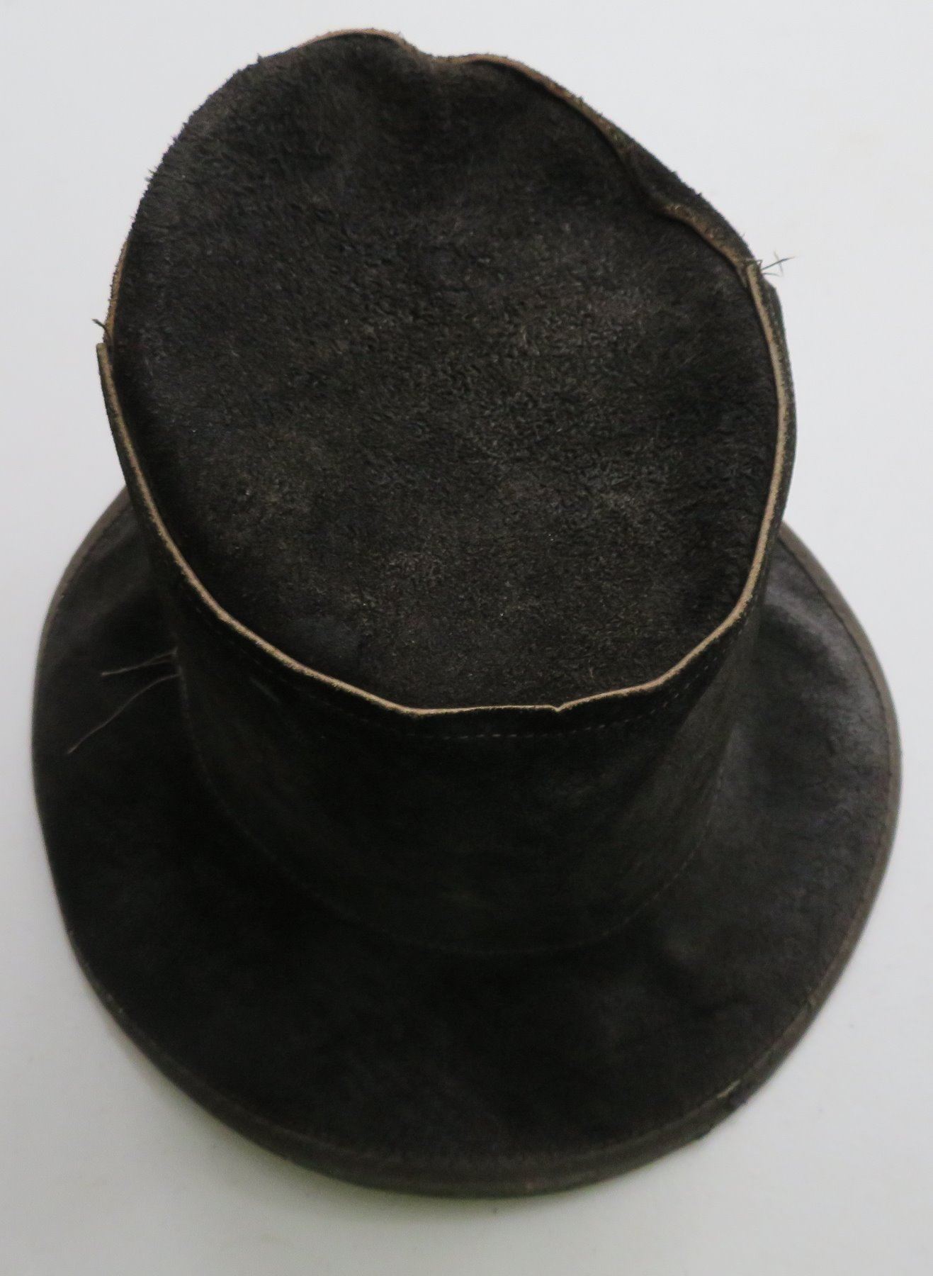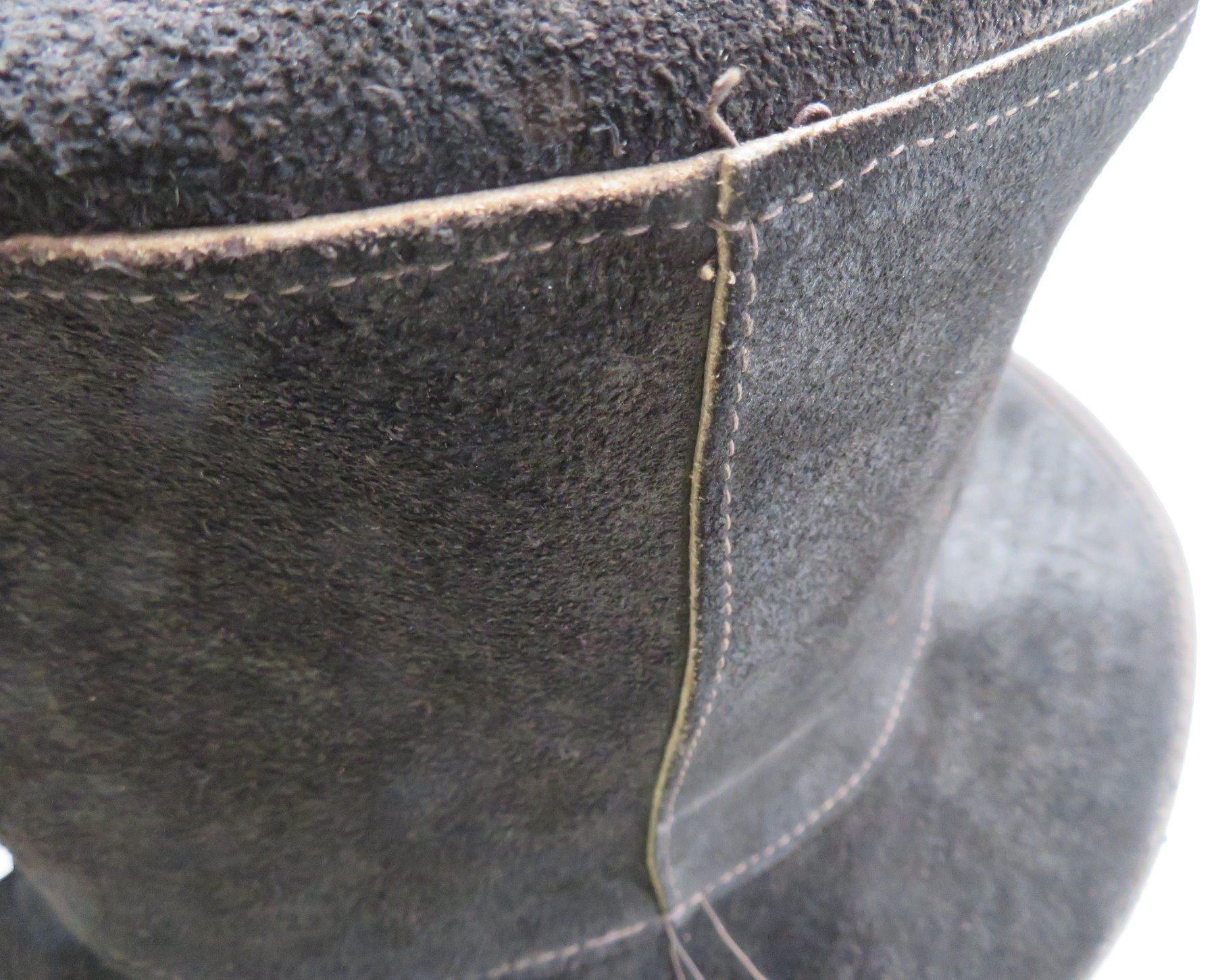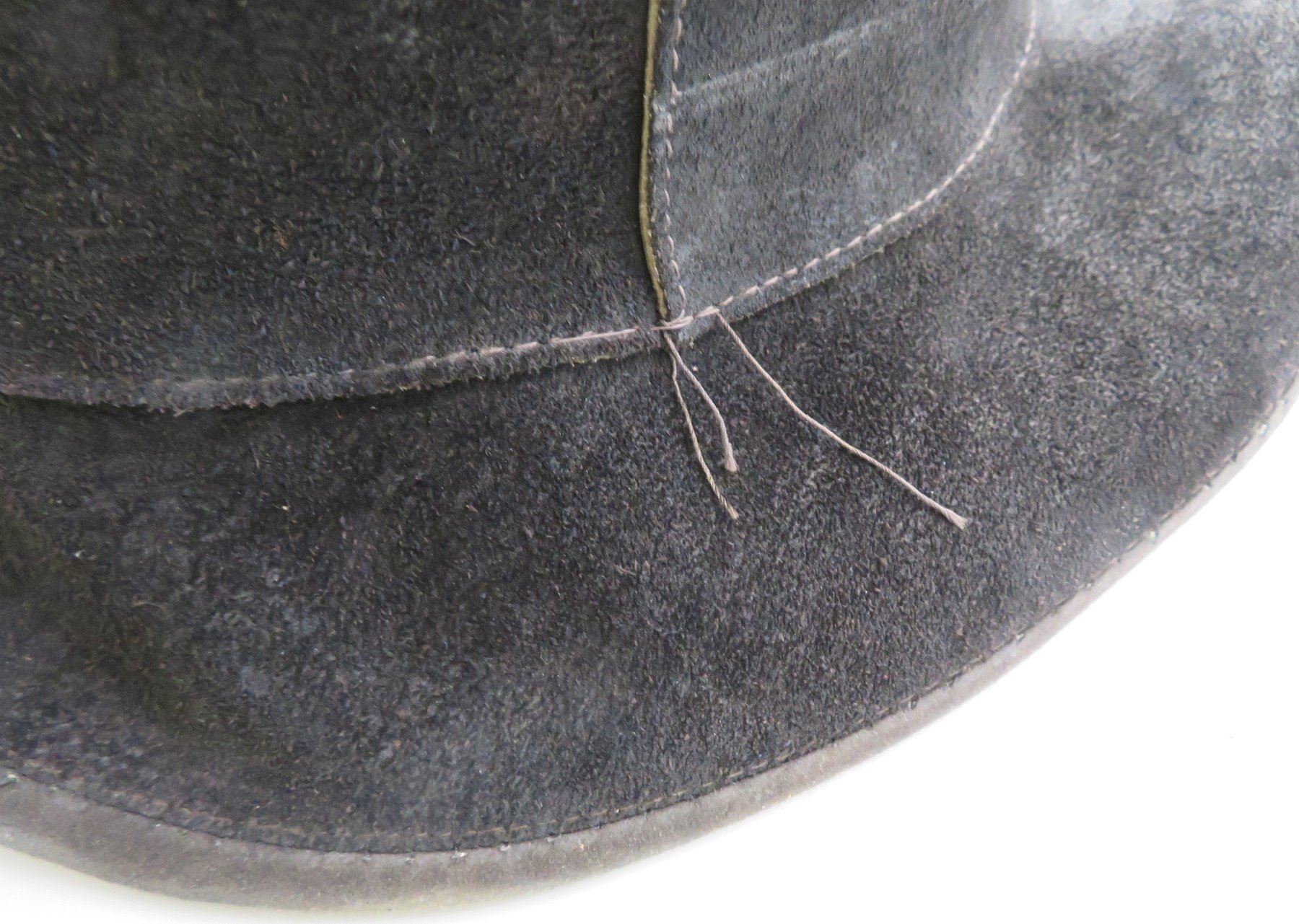Leather Undertaker's Hat, early 20th century item. Made of black leather, the item measures 11" x 7". Skully, USA, large hat. Condition: Some wear, see images. Shipping: $30.00 w/insurance and signature, double-boxed.