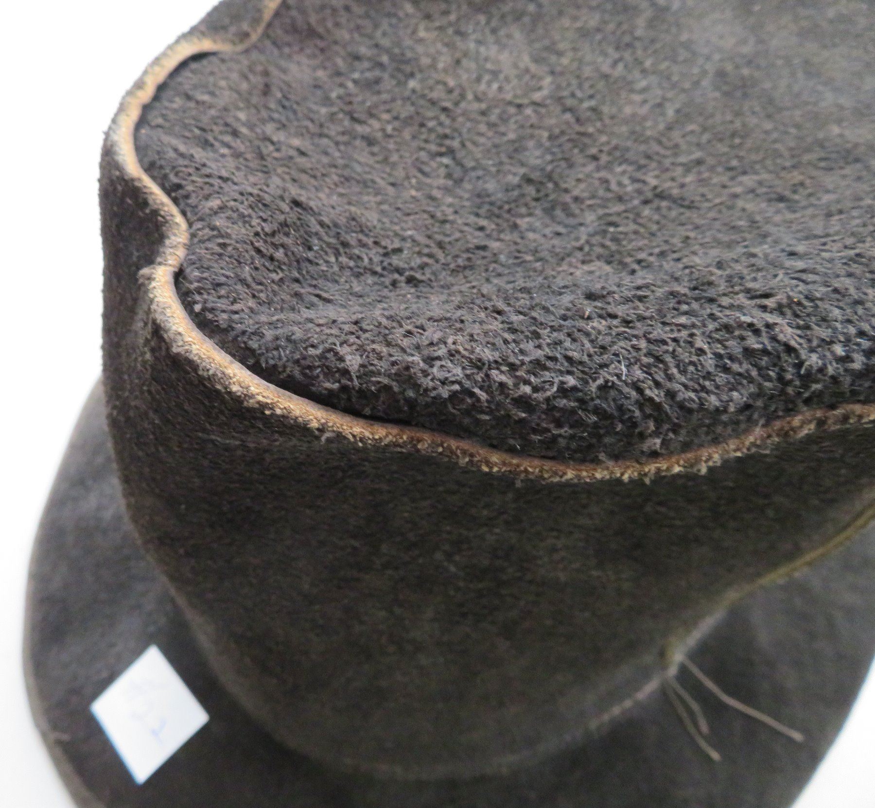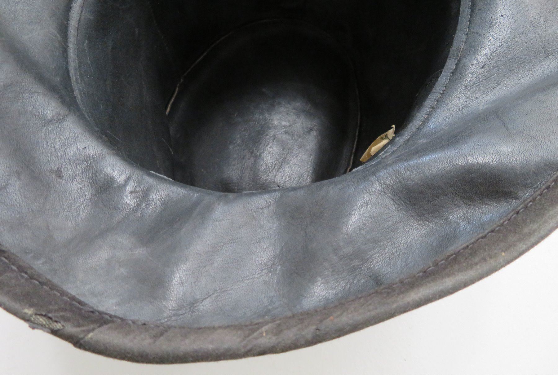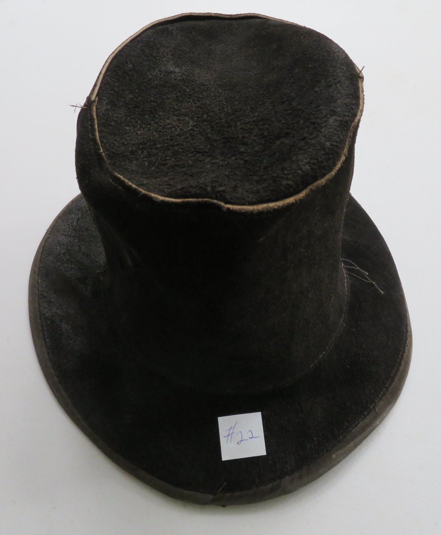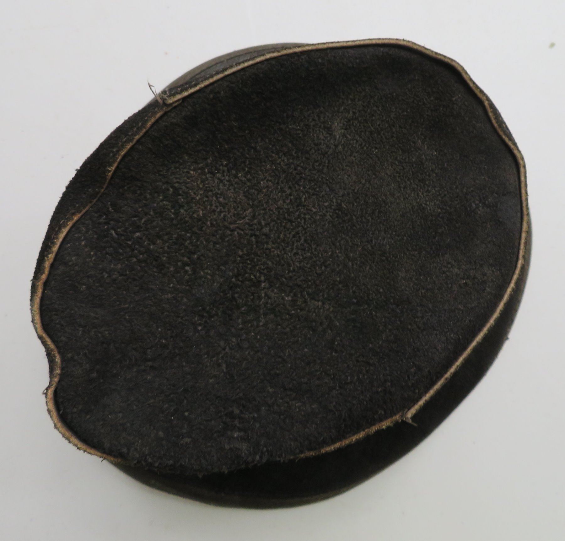 Leather Undertaker's Hat, early 20th century item. Made of black leather, the item measures 11" x 7". Skully, USA, large hat. Condition: Some wear, see images. Shipping: $30.00 w/insurance and signature, double-boxed.