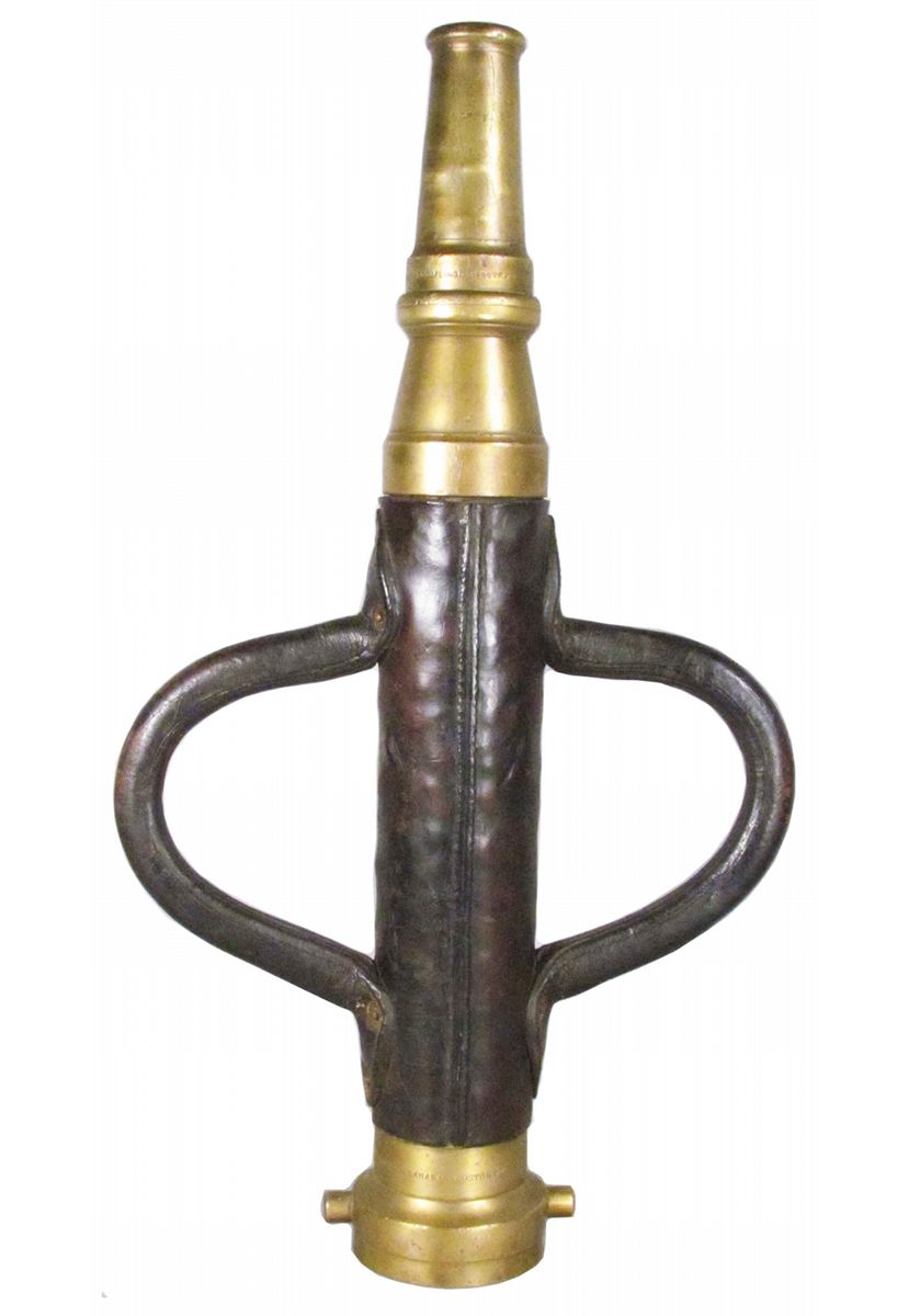 Leather and Brass Fire Nozzle with handles by the C. Callahan Co. Boston, Mass. Excellent condition. 21 1/2 inches tall.