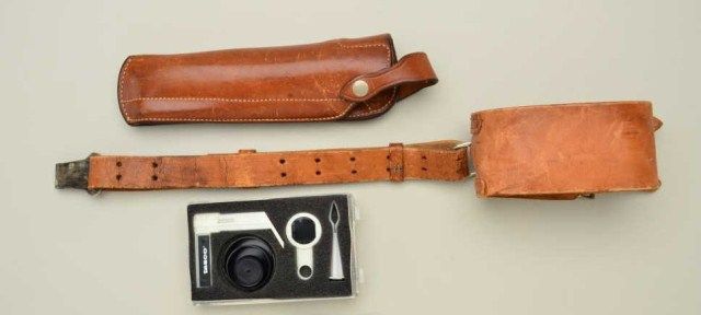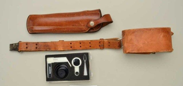 Leather arm strap with brass hook for offhand target rifle shooting in style 1940-60’s and used with Winchester Model 52, good condition. Bianchi #129 cross draw holster, good condition and tasco scope guide inpackaging. Est.; $25-$50.