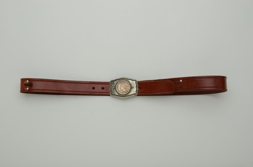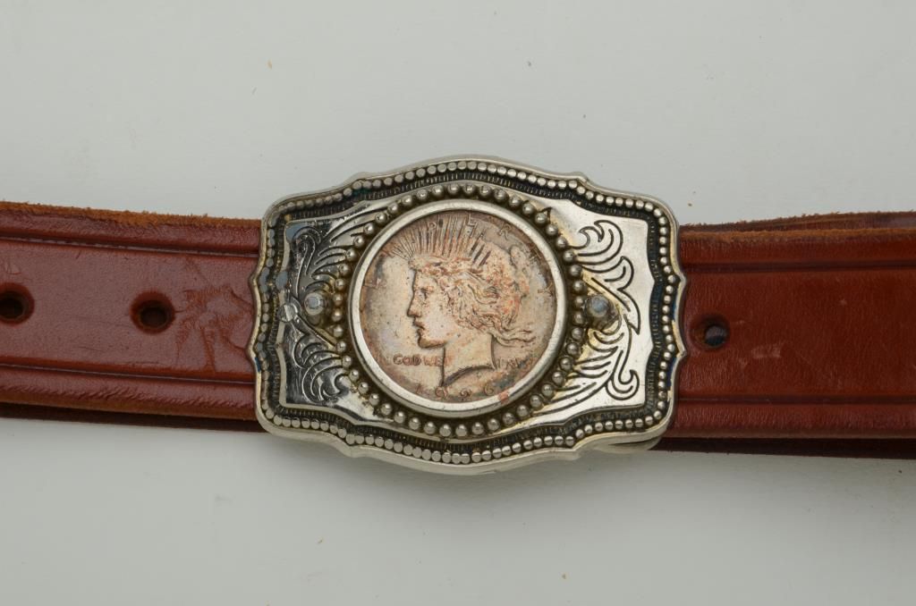 Leather belt with silver Peace dollar in buckle dated 1926. Est.: $50-$75.