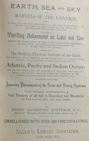 or Marvels of the Universe first edition1887 by Henry Davenport Northrop with over 300 fine engravings. A fascinating book covering natural history, strange people of the world, unusual animals marvels of the sky and more. From the Frawley family estate. Est. 150-250