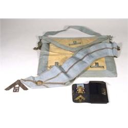 Leather cased silver and enamel printer's Masonic medal no. 5593 and a turquoise and cream cloth Masonic apron with silver badges, presented to Wbro. John W. Hunt, Johann Gutemburg Lodge no. 5593