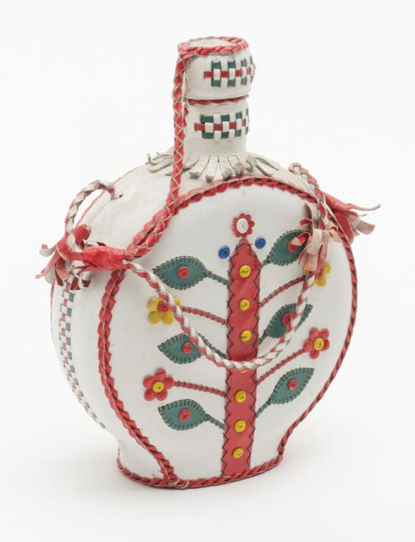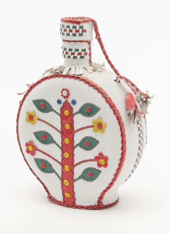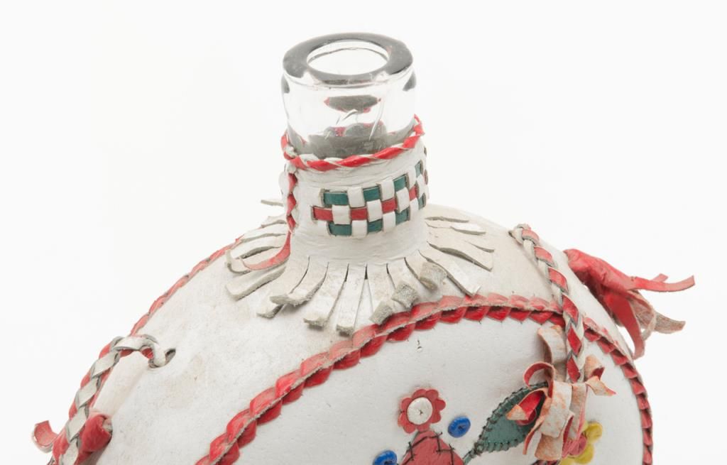 Leather covered glass flask, multi-colored decorative artwork style, approx. 8” in height. Est.: $30-$60.