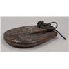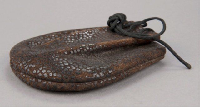 A leather kinchaku with a draw-string top, the supple leather covered with sequins. Late 19th century. 5 1/2" x 4 1/2". The Helen & Jack Mang Collection Edo Miyanoshita, Hakone, Japan