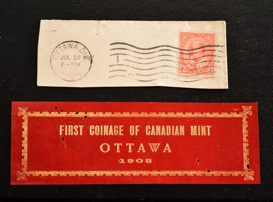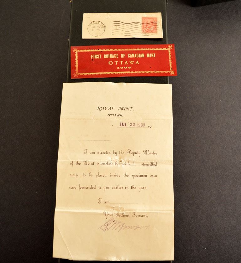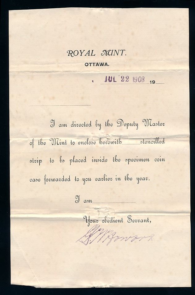 Leather label insert for 1908 Specimen set case, Charlton #6c. Included is letter from the Royal Mint, Ottawa, dated Jul 22, 1908, stating " I am directed by the deputy master of the mint to enclose hearwith …. Stencilled strip to be placed inside the Specimen Coin case forwarded to you earlier in the year. I am .... Your obedient Servant, (signed)". Also included is a cut part of the envelope, with stamp and postmark.