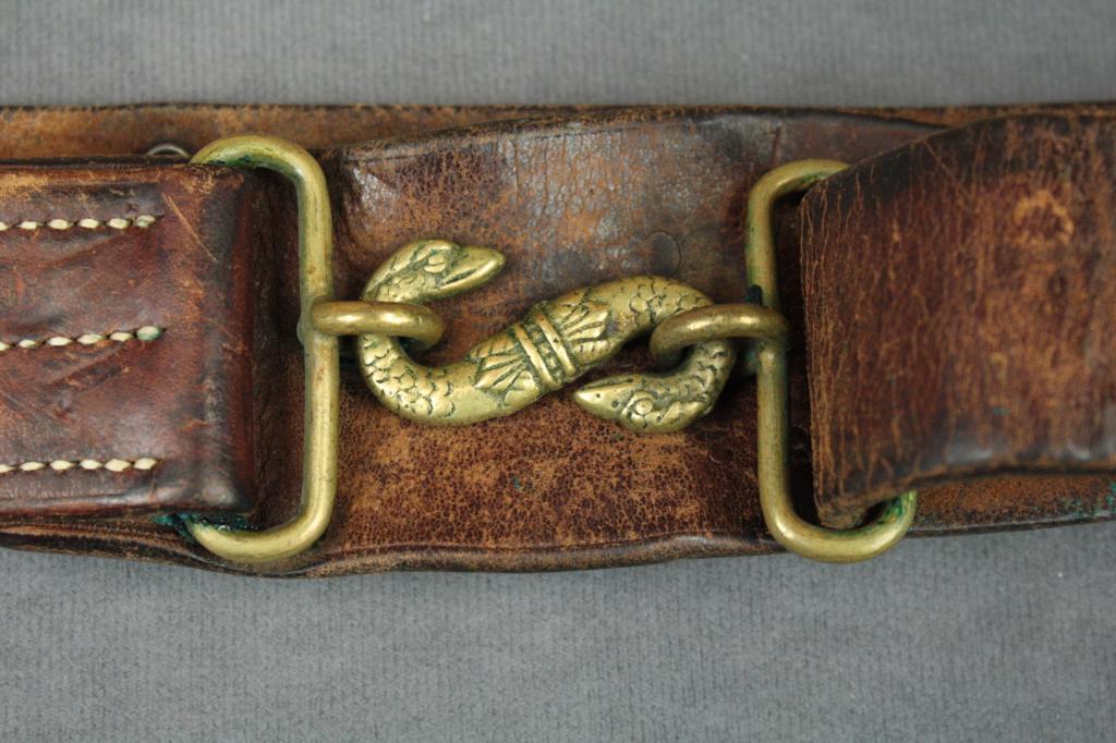 Leather military or police style belt with brass keepers and two headed snake brass clasp in overall good condition; one tongue is marked with a variety of numbers and “Ottawa”; possibly Canadian Mounted Policerelated. Est.: $100-$200.