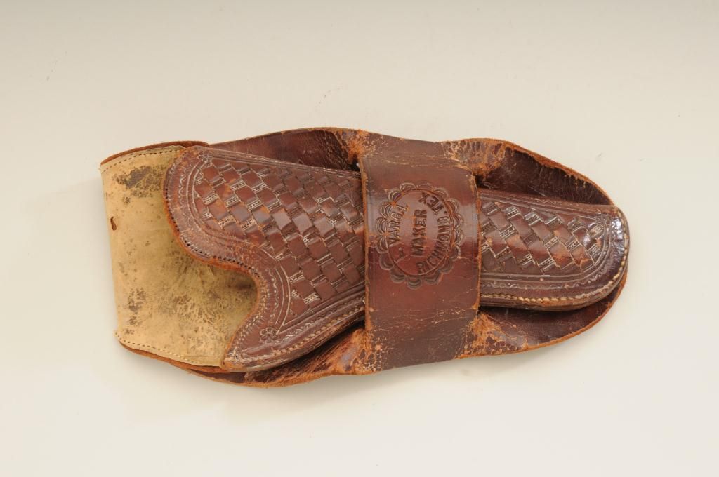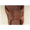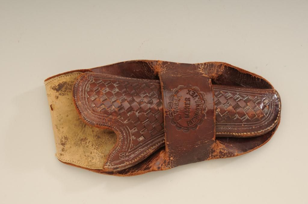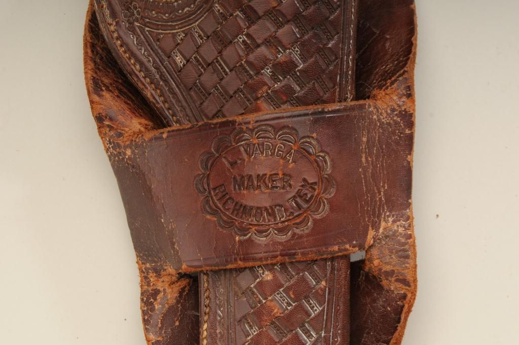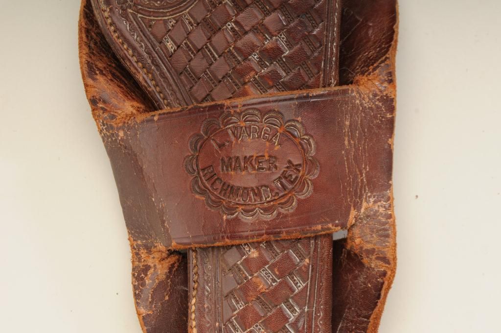 Leather single loop basketweave holster for a Colt SAA revolver marked “L Varga, MAKER, Richmond, Tex.” in overall fair + to good condition, chamois lined with wear creases at the four corners of the “loop”; a desirablemaker for collectors. Est.: $750-$1,500.