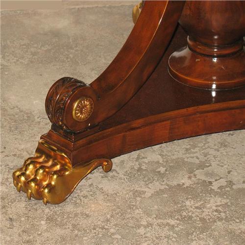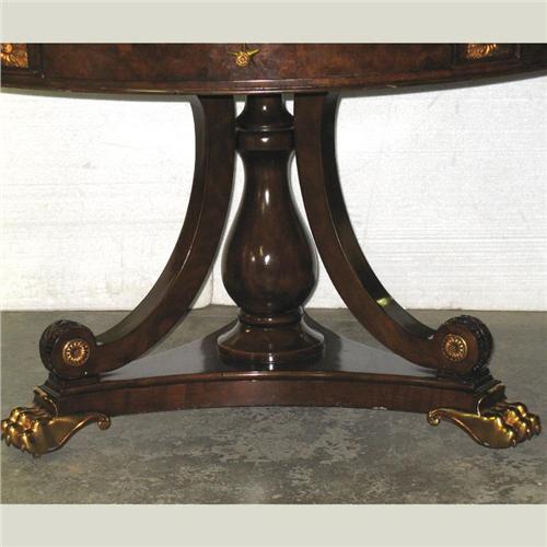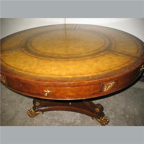 Leather top mahogany center table; tooled round leather top; two drawers in apron with brass ormolu mountings; vase shaped pedestal base with three C-scroll supports; brass paw feet; early 20th C.; 30" high x 50" diameter; no visible defects