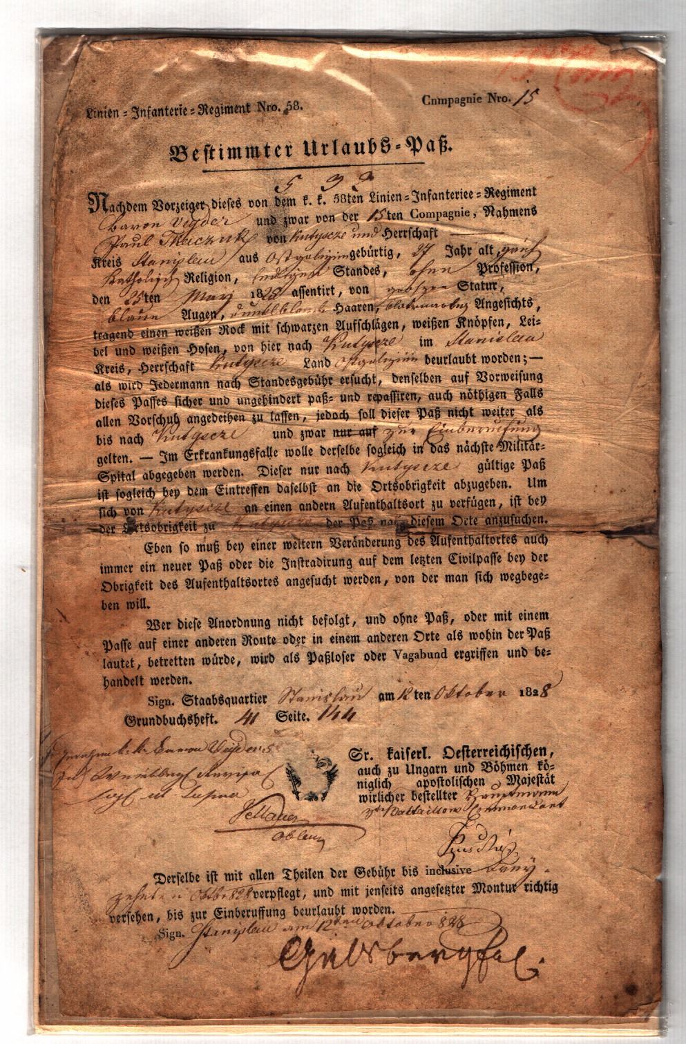 Leave slip given to a Jewish soldier in the Austro-Hungarian army, 1838, includes a list of the soldier's clothes and a discription of his appearance. 2 pages, in German. Reasonably timeworn. Dimensions: 22.5x35 cm.