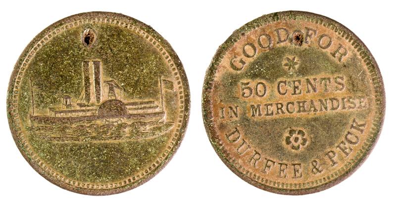 Obverse: (pictorial steamship); reverse: Good For / 50 cents / In Merchandise / Durfee & Peck. Br, 23mm. Very fine condition, indented at top of each side.