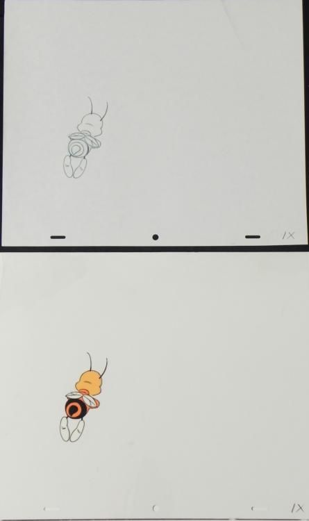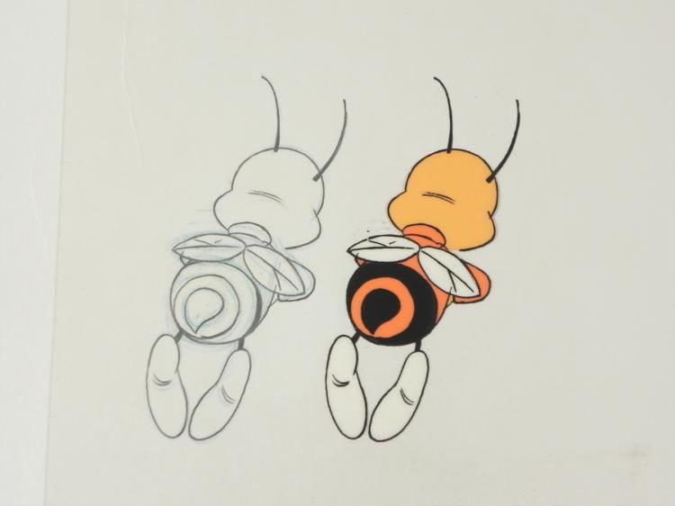 Where are you going? * * Original Animation Cel & DrawingMedium: Hand painted acetate celDetails: Animation notations and peg holes * * Original "rough" animation drawing, in non-photo blue and black pencil * * Size of cel: 10 1/2 x 12 1/2 inchesSize of drawing: 10 1/2 x 12 1/2 inches * * Condition: Very good * This is an original hand-painted cel set-up used in the production of * the "Cheerios commercial." Each one-of-a-kind set-up represents a slight * change in position of the characters. When individually photographed * and projected in rapid succession, the images * appear to move. To created production cels, the original animator's * drawing is transferred onto an acetate cel (by hand-inking and/or photo * copying). The cel is then hand-painted on the reverse side.