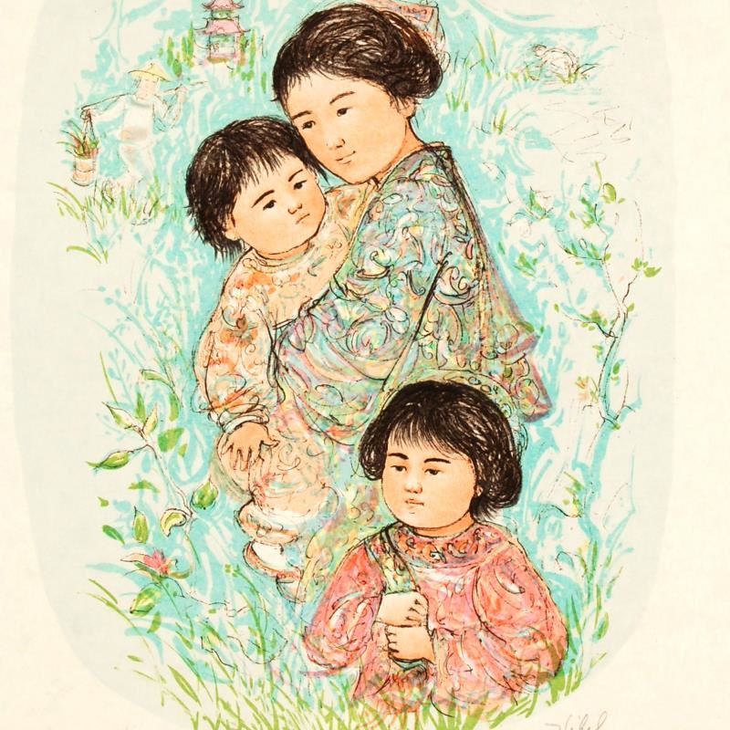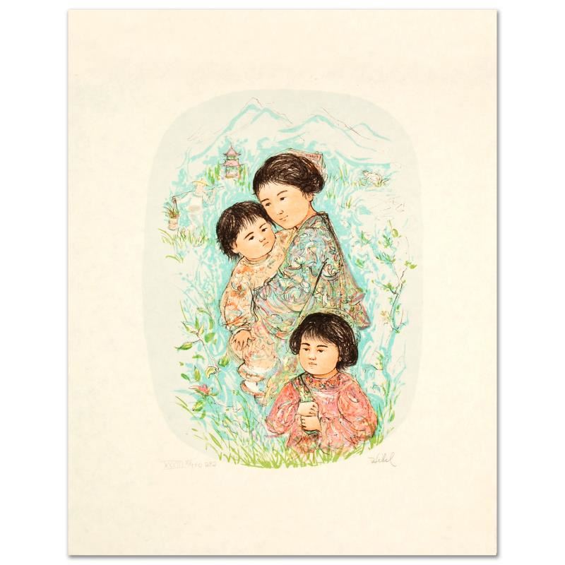 "Leaving the Garden" is a limited edition lithograph on paper, numbered and hand signed by Edna Hibel (1917-2014). Includes Certificate of Authenticity! Measures approx. 17.5" x 22" (with border), 11" x 15" (image).