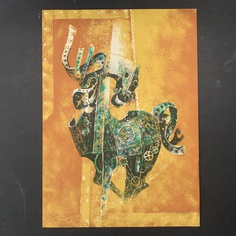 A limited edition print by Lebadang, signed lower right and numbered EA lower left. This piece is of a horse in protective equipment, as if he were ready for a joust. This piece is in near excellent condition with very minor crease lower right.