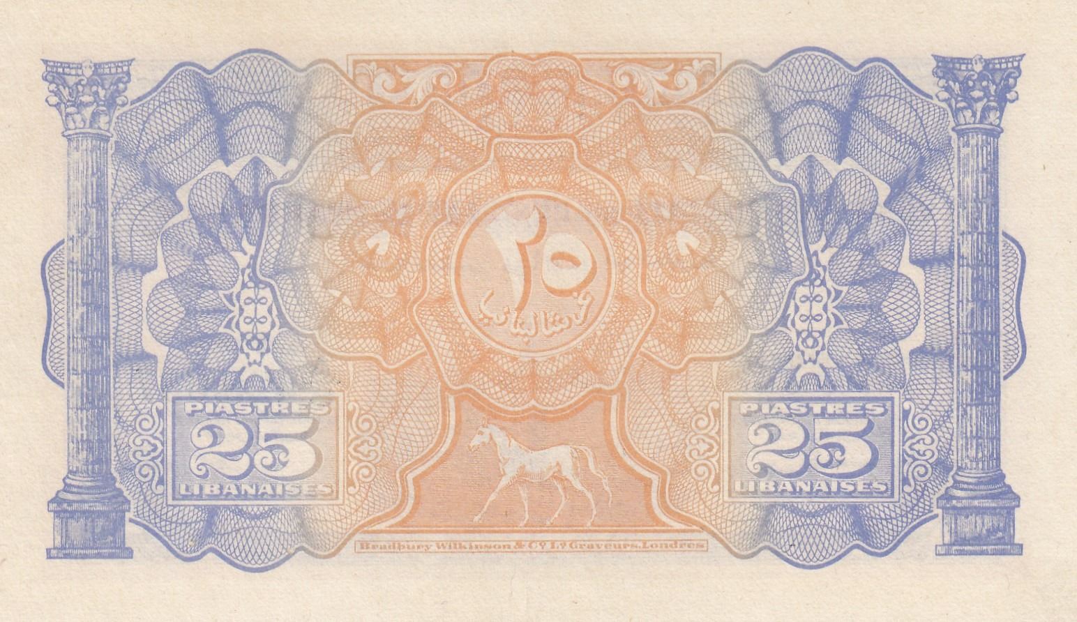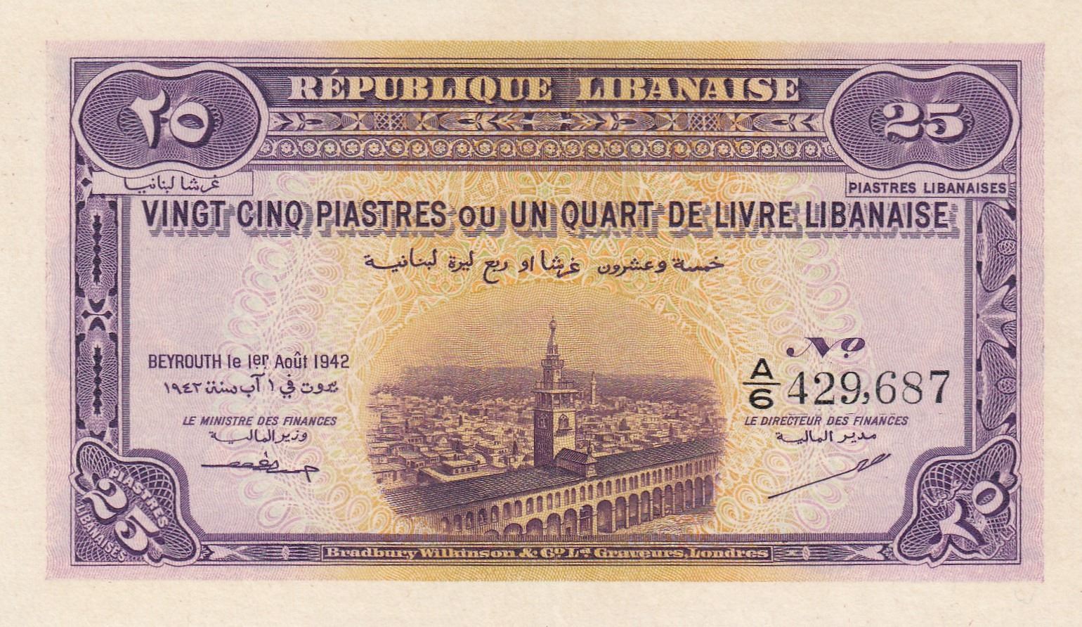 Lebanon, 25 Piastres, 1942, AUNC, p36br/serial number: A/6 429687