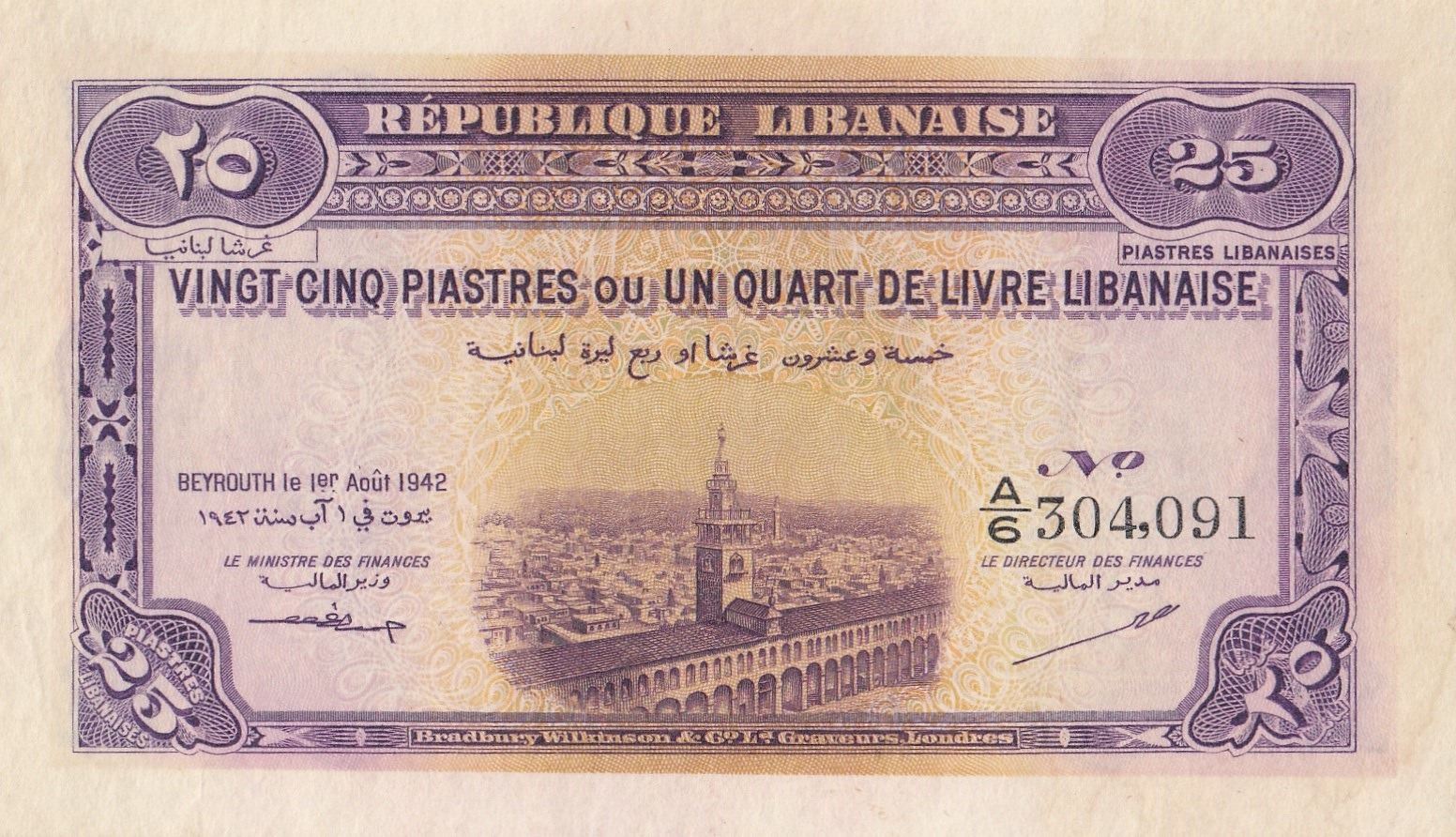 Lebanon, 25 Piastres, 1942, XF, p36br/serial number: A/6 304091