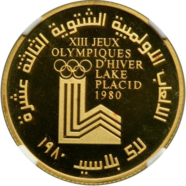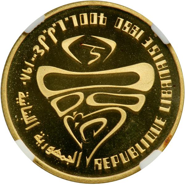 Lebanon. 400 Livres, 1980. Fr-1; KM-34. Weight 0.2315 ounce. For the 1980 Winter Olympics at Lake Placid. Mintage 1,000 pieces. Only gold issue of Lebanon. Rare. NGC graded Proof 69 Ultra Cameo.