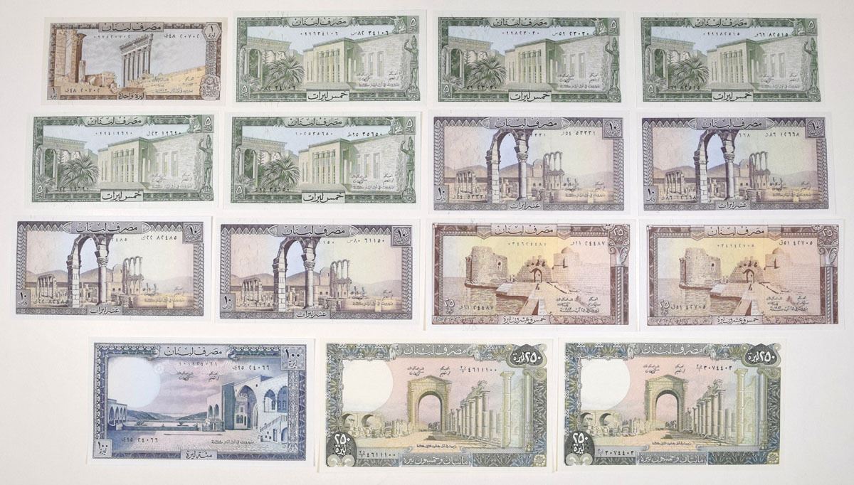Lebanon, 1964-88. Lot of 15 Issued Banknotes, Includes: 1 Livre, P-61; 5 Livres, P-62 (5); 10 Livres, P-63 (4); 25 Livres, P-64 (2); 100 Livres, P-66; 250 Livres, P-67 (2). Notes range from AU to UNC condition. (15). Sold "AS IS" no returns accepted.