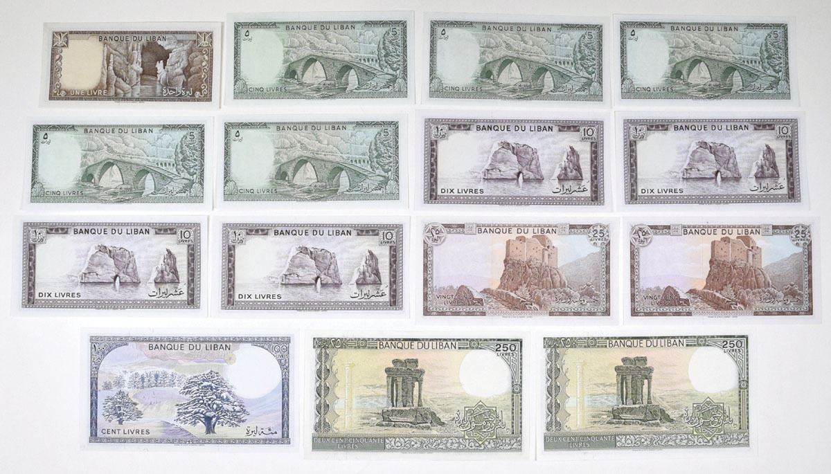 Lebanon, 1964-88. Lot of 15 Issued Banknotes, Includes: 1 Livre, P-61; 5 Livres, P-62 (5); 10 Livres, P-63 (4); 25 Livres, P-64 (2); 100 Livres, P-66; 250 Livres, P-67 (2). Notes range from AU to UNC condition. (15). Sold "AS IS" no returns accepted.