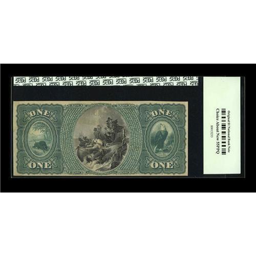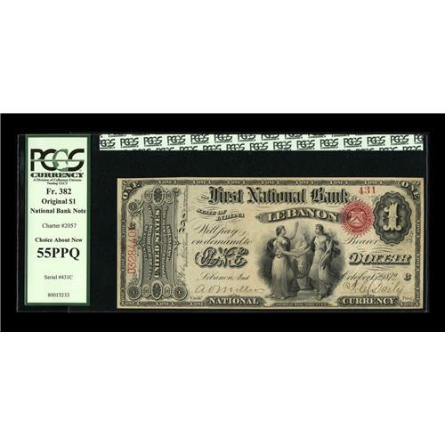 <B>Lebanon, IN</B></I> - $1 Original Fr. 382 <B>The First NB</B></I> Ch. # 2057<BR>This <B>PCGS Choice About New 55PPQ</B></I> First Charter Ace is from a small hoard of this type from this institution, now quite widely dispersed. Its sheet mate, the "B" position note, is listed in the census as "CU" . Our most careful examination through the encapsulation reveals only a corner fold at lower right to keep this well centered note from that higher category. The original ink signatures are clear and legible. Overall, this is an example that appears to fully merit the "premium" accolade bestowed by PCGS. Notes as attractive as this one typically sell at levels higher than their technical grade might suggest.