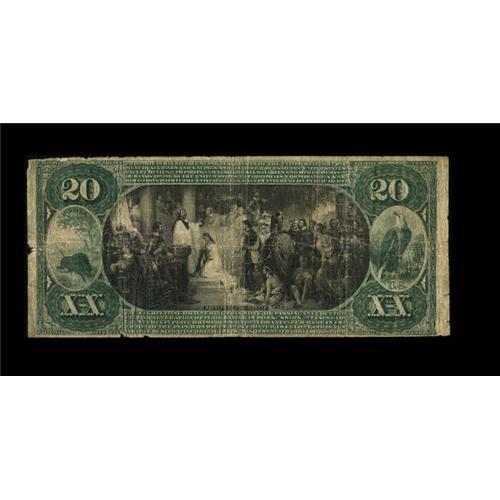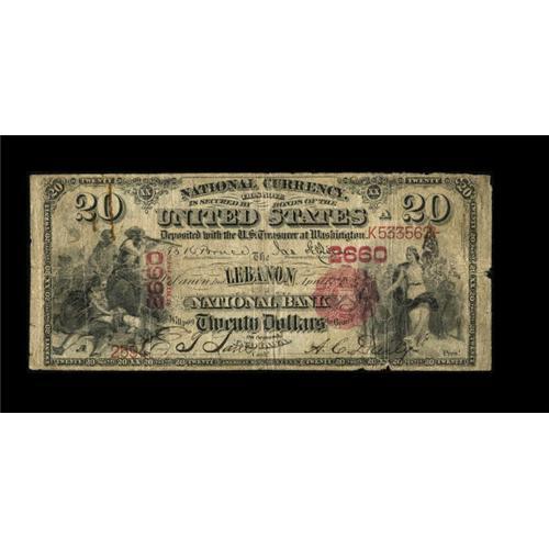 <B>Lebanon, IN</B></I> - $20 1875 Fr. 435 <B>The Lebanon NB</B></I> Ch. # 2660<BR>This community had two banks that issued the First Charter designs. The other, The First National Bank, is well known within the collecting fraternity as the source of a small hoard of high grade and uncirculated Aces and Lazy Twos. Not so this institution, which had just two survivors listed among its large emissions prior to tonight's offering, both $20 notes from the 1875 series. This <B>Very Good</B></I> example makes a third. Our Florida United Numismatists 2006 auction included one of the others, an About Fine, which sold for $5,750. This note is virtually the visual equal of that offering, but bears the assigned grade due to some unobtrusive margin roughness here and there. The ink signatures remain exceptionally dark, in spite of the obvious circulation this prohibitively rare note has seen. Just 15 of the $20 1875 Series have now been documented for the entire state of Indiana, widely scattered amongst 10 issuers. We expect a realization in the range of...<BR><BR><b>Shipping:</b> Coin/Currency (<a target="_blank" href="http://www.heritageauctions.com/common/shipping.php">view shipping information</a>)