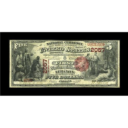 <B>Lebanon, IN</B></I> - $5 1875 Fr. 403 <B>The First NB</B></I> Ch. # 2057<BR>Considerably scarcer than either the $1 or $2 denomination from here in the First Charter designs, this $5 1875 is a very presentable <B>Fine</B></I> and is one of only three of its type and denomination documented from this issuer. Given its underlying scarcity, we anticipate that bids will reach no less than...<BR><I>From The Bill and Kathy Stella Currency Collection</B></I><BR><BR><b>Shipping:</b> Coin/Currency (<a target="_blank" href="http://www.heritageauctions.com/common/shipping.php">view shipping information</a>)