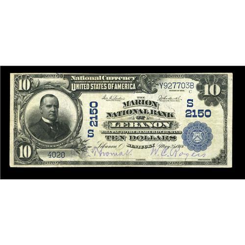 <B>Lebanon, KY</B></I> - $10 1902 Plain Back Fr. 631 <B>The Marion NB</B></I> Ch. # (S)2150<BR>This <B>Very Fine+</B></I> is only the fourth $10 Plain Back to surface from here and is the highest grade yet documented.
