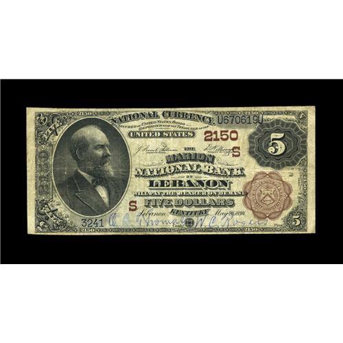 <B>Lebanon, KY</B></I> - $5 1882 Brown Back Fr. 474 <B>The Marion NB</B></I> Ch. # (S)2150<BR>An attractive $5 Brown Back which is one of just three such examples from here listed in the census. Pleasing <B>Fine-Very Fine.</B></I>