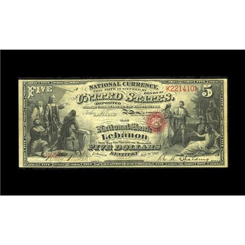 <B>Lebanon, KY</B></I> - $5 Original Fr. 399 <B>The NB of Lebanon</B></I> Ch. # 1694<BR>A lovely example from by far the scarcest of Lebanon's four issuing banks. This institution lasted only until the expiration of it's charter in 1889, producing First Charter notes only. This piece is likely the nicest extant from here, and its certainly the finest we've ever seen. It's also a high grade representative of a rare Kentucky type, as it just one of 16 Original Series FCP fives listed in the census from this state. <B>Very Fine-Extremely Fine.</B></I>