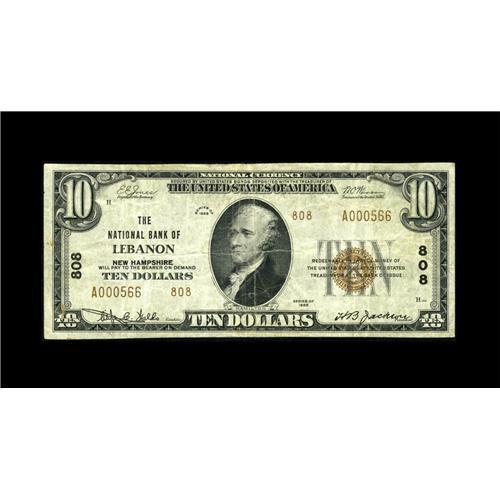 <B>Lebanon, NH</B></I> - $10 1929 Ty. 2 <B>The NB of Lebanon</B></I> Ch. # 808<BR>This one bank town is represented in the census by just two notes of this type and denomination, including this <B>Very Fine</B></I> example. This community, like so many in New England, was a long time center of textile industry activity.