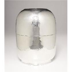 Lebolt vase, cylindrical form, hammered silver with applied monogram, 7”h; with a Sedlacek pitcher, (not shown), hammered silver with applied inscription, 9”h; with Lebolt place card holders, (not shown), set of 12, 1”h, all marked
