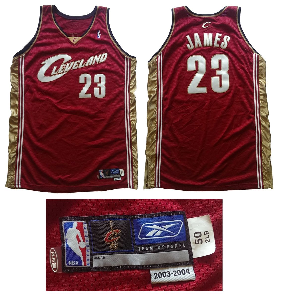 Lebron James 2003-04 Cleveland Cavaliers Rookie Game Worn NBA Jersey. The proper "Reebok" label is found with proper placement, marked with the logos of the NBA and the Cavaliers, with flap tags affixed reading "2003-2004" and "50 2LB." A nice degree of wear is particularly evident with loose threads and sweat-curling/wash wear in the tags and font on both the front and rear of the jersey. The Union Tag appears to have been removed on the inside of the jersey. Overall the jersey shows excellent use. Comes with a Certificate of Authenticity with matching #'d holograms and online verification from VA Auctions.